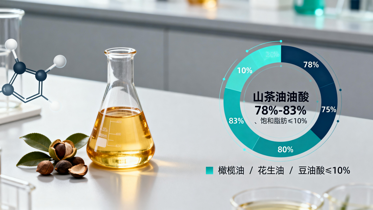 油脂的营养价值,主要取决于其脂肪酸类型与比例。山茶油最突出的特点是单不饱和脂肪酸(MUFA)含量极高,其中以油酸(Oleic Acid, C18:1)为主,占比通常在78%–83%之间。作为对比: