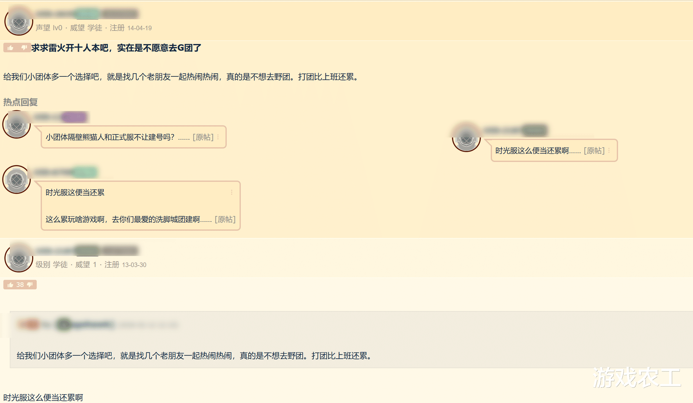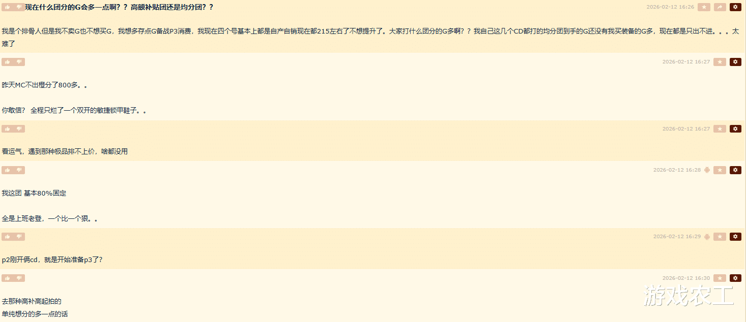 比较意外的是,农工在论坛中看见了有人自称为排骨人,这种自称在论坛中很少看见,毕竟很多时候大家对排骨人比较抵触。但是农工看了下评论区,整体大家比较和谐,而该排骨人问的问题则是:“现在什么团分的G会多一点啊?高额补贴团还是均分团?”而下面不少的玩家也给出了建议。不过现在对大家来说最大的问题还是如何提高团本收益,不仅仅是排骨人,普通玩家也需要。