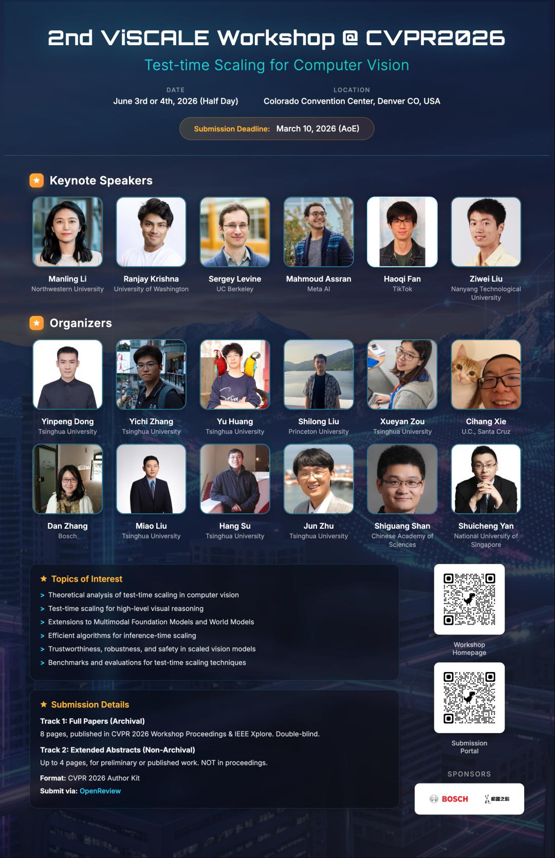 2026 年 6 月,CVPR 第二届计算机视觉推理扩展研讨会(ViSCALE 2026) 将在美国重磅回归!继首届研讨会成功开启 TTS 在视觉领域的无限可能后,本届 ViSCALE 由来自 清华、普林斯顿、UC Santa Cruz、NUS 等全球顶尖机构的学者联合举办,将汇聚全球顶尖学者,共同探索如何让视觉模型通过计算扩展突破现有模型的能力瓶颈。