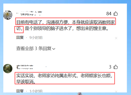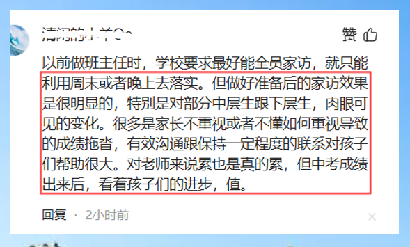 但这事儿真的全是形式主义的锅吗?评论区里也有另一番景象。一位老师网友说,以前做班主任时,学校要求全员家访,只能周末晚上去跑。但只要准备充分,对那些中层生和下层生的帮助是肉眼可见的——很多家长不是不想管,是不知道怎么管,一次有效的沟通真能改变孩子的拖沓习惯。等到考试出分看到孩子进步,那种累觉得“值”。