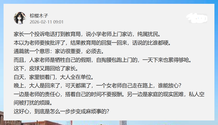 今天刷到一位网友的短图文,家长电话打到教育局,投诉小学老师家访是扰民之举。本以为现在都在喊减负,老师怎么也得挨两句批评,