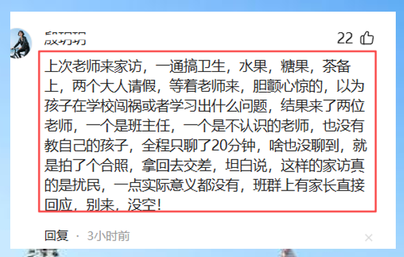 翻看评论区,一位家长的吐槽特别真实:上次老师来,全家像迎接检查一样,搞卫生、备水果、洗糖果,两个大人还得特意请假在家候着。大家胆颤心惊,以为孩子闯了大祸,结果来了俩老师,全程聊了不到20分钟,正事没聊几句,主要是为了拍张合照拿回去交差。