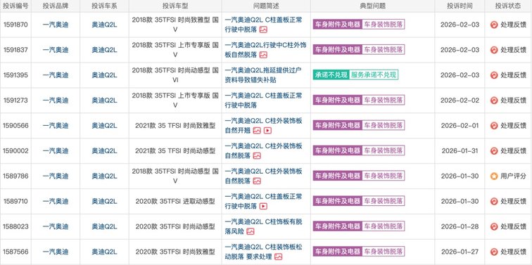从产品角度看,Q2L作为奥迪的入门SUV,2018年国产上市后凭借品牌和设计吸引了不少消费者,2021年年销量曾接近4.9万辆。但材料耐久性缺陷无疑影响了用户体验,甚至构成安全隐患。