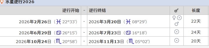 打开自己的本命星盘,你会发现有很多行星都是处于逆行状态,因为除了太阳、月亮、南北交点不会逆行。完全没有任何行星逆行的人很少。而我们关心的水星逆行一年会发生三次。2026年的水星逆行都发生水象星座,分别是2月份水双鱼、6月份水巨蟹、10月份水天蝎。关注星芒,星芒会持续播报天象变动对我们的影响。