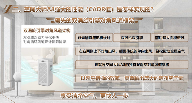 双涡旋引擎风道:非对称设计推动360°立体循环,实测中193㎡大平层全屋同步净化,地下室霉味被彻底“吹”走。