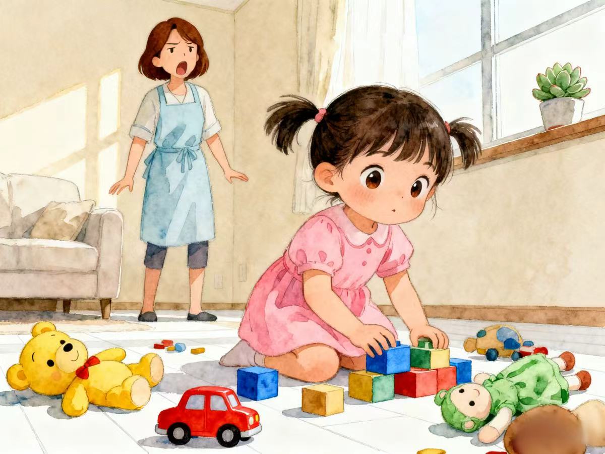 孩子(丢下积木跑开):“我不收拾!收拾玩具好麻烦!”