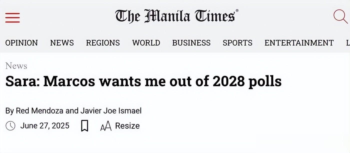 首先,是小马科斯在这两年里疯狂打压莎拉,搞什么贪腐调查、安全威胁之类的,把她搞得没法参选,这是最直接的路子,甚至2025年菲律宾国内媒体也报道过,莎拉直说了,马科斯家族在想一切办法让自己无法参选。但这招风险也大,搞不好激起民变,到时候马科斯自己都下不来台。