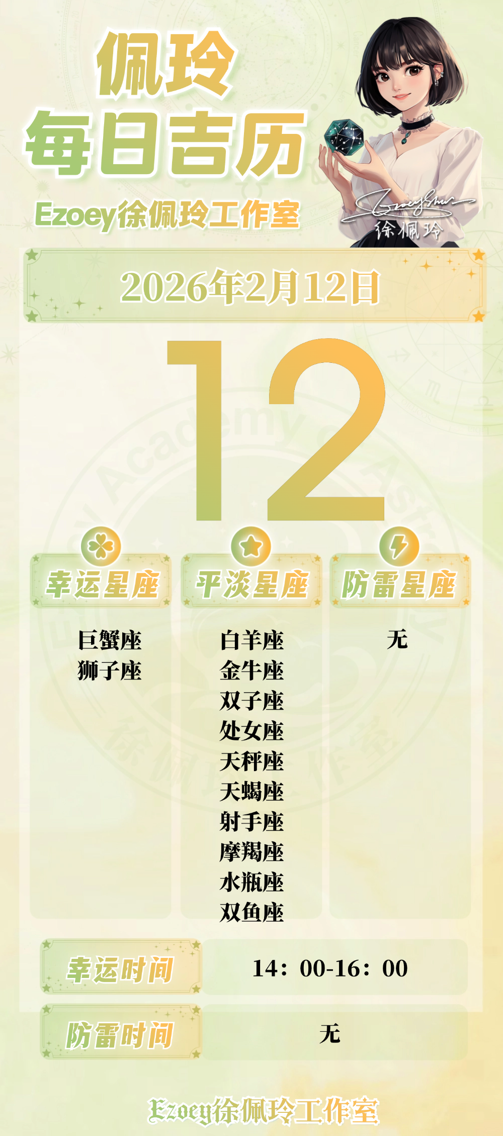 【2.12日播报】开心助力日 幸运星座:巨蟹座、狮子座——Ezoey徐佩玲26年星座播报