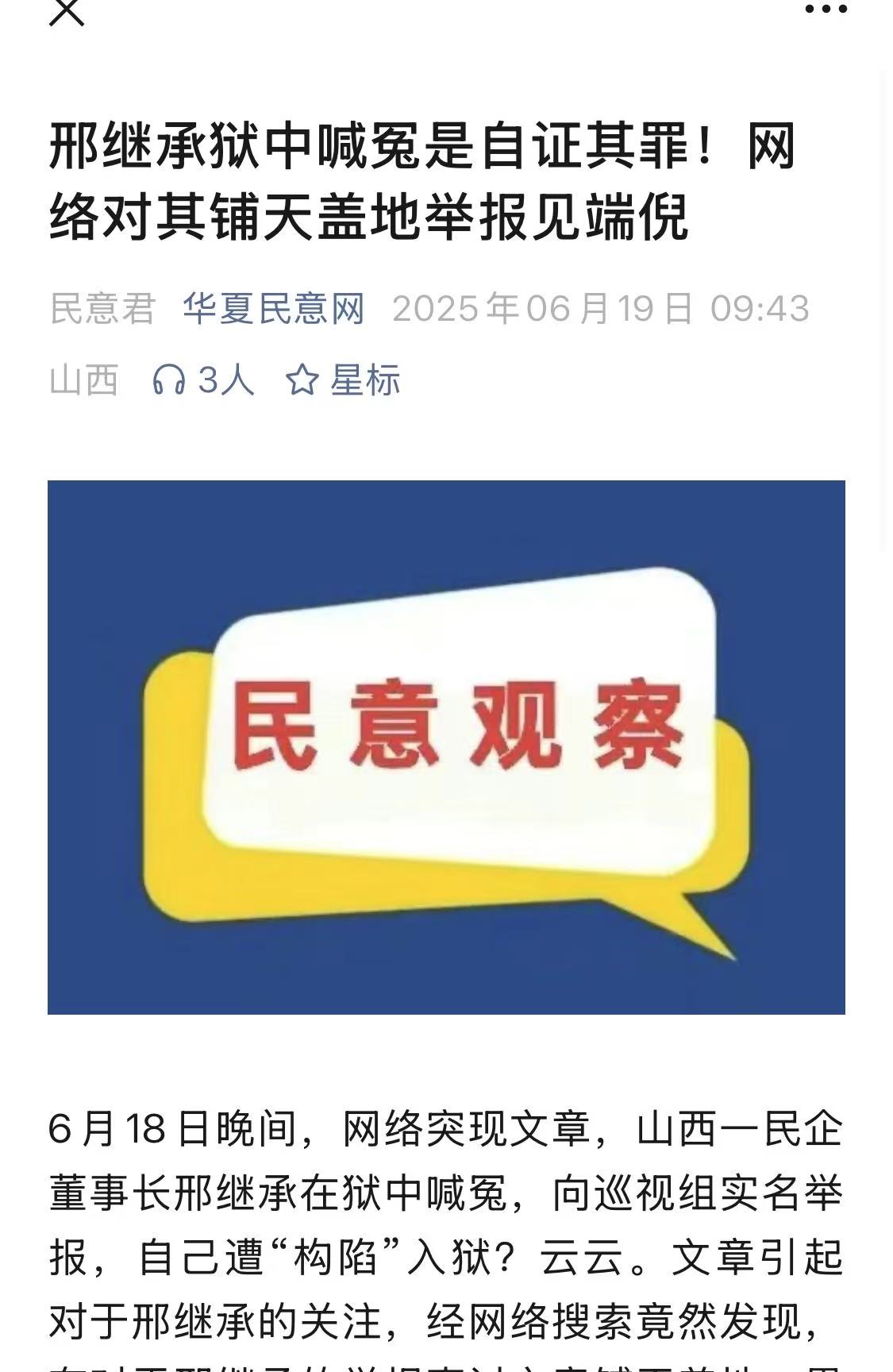 6月中旬,网络上出现为山西民企董事长邢继承喊冤的文章,称其在监狱中实名举报自己遭“构陷”。此文引起各界对邢继承事件的关注。然而,在网上举报声讨揭露他的信息却是铺天盖地,其在狱中喊冤无异于难脱清白。