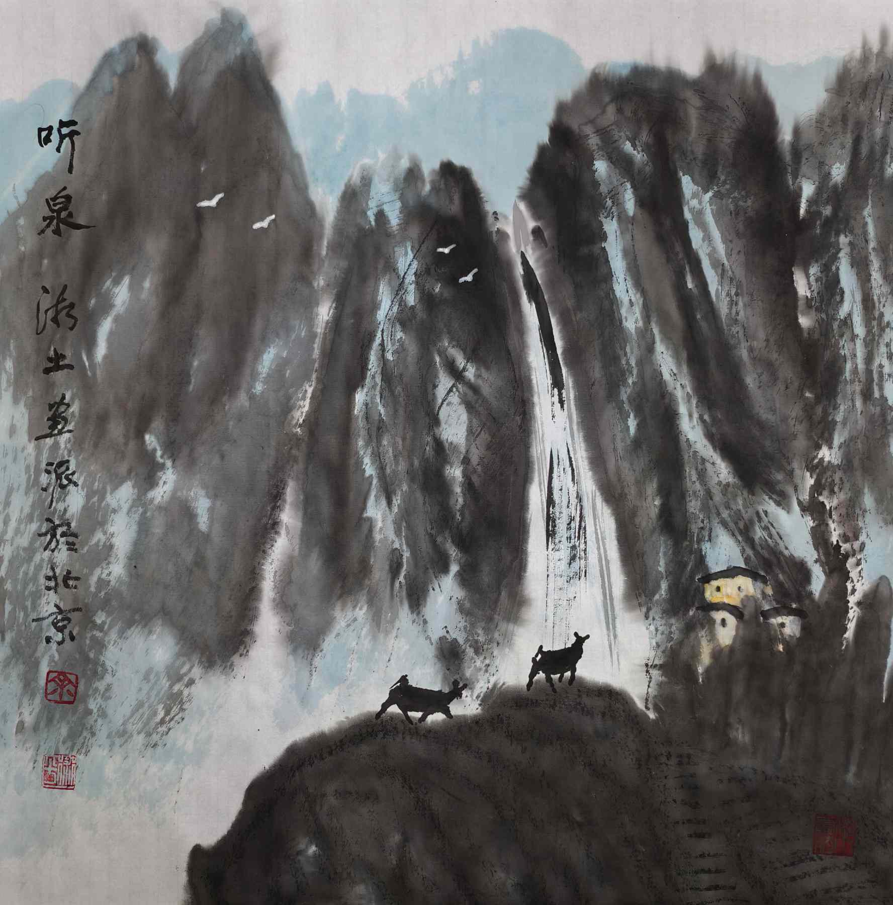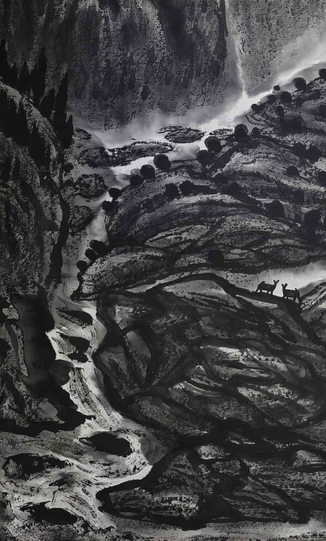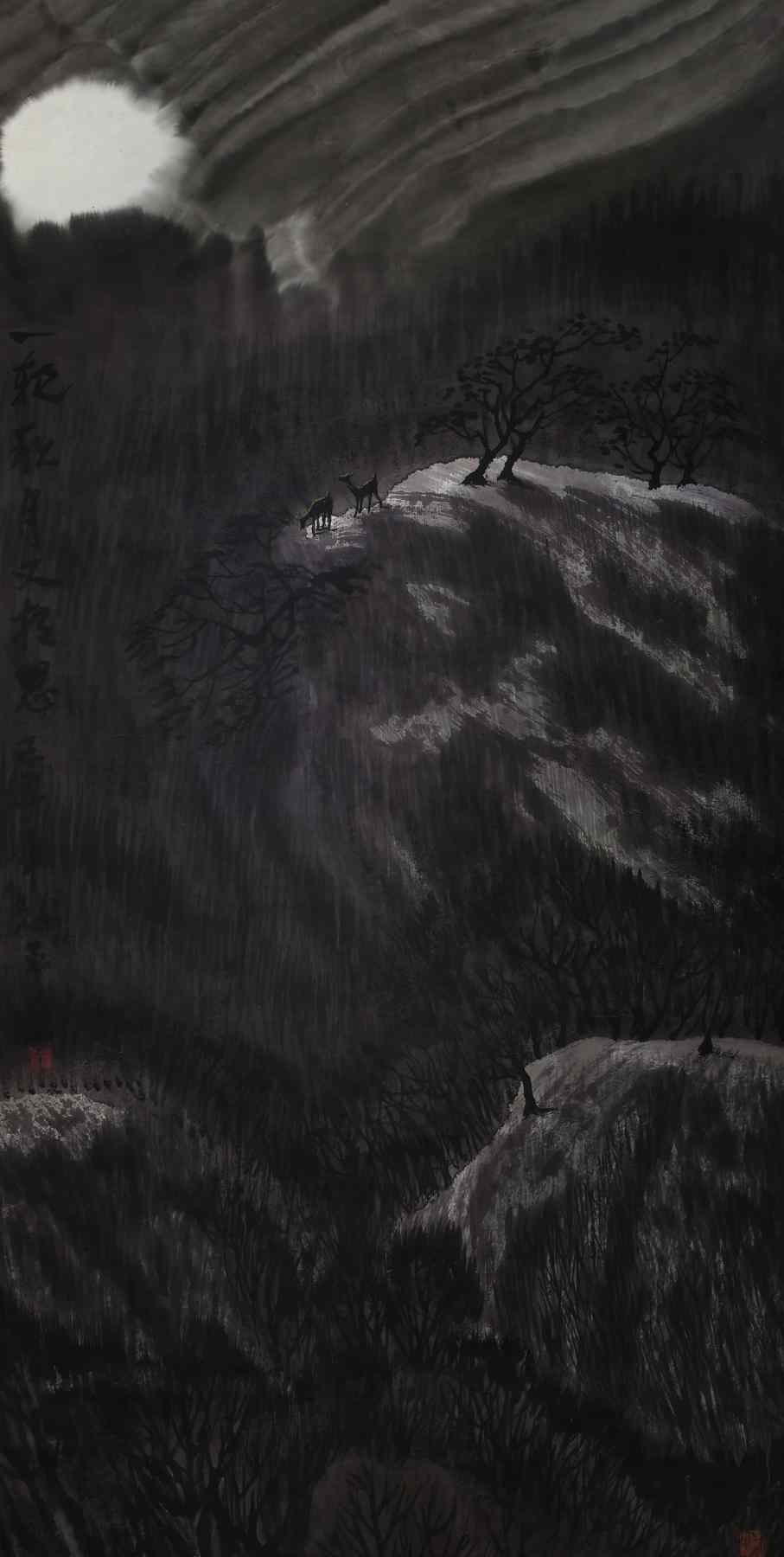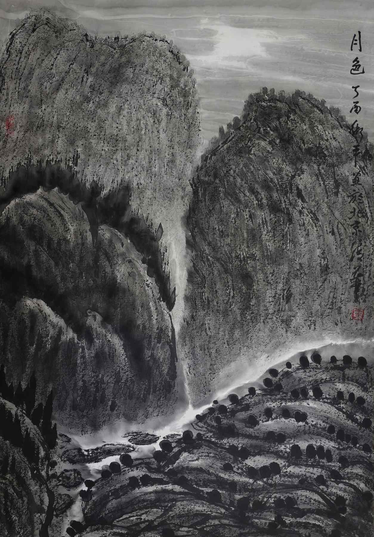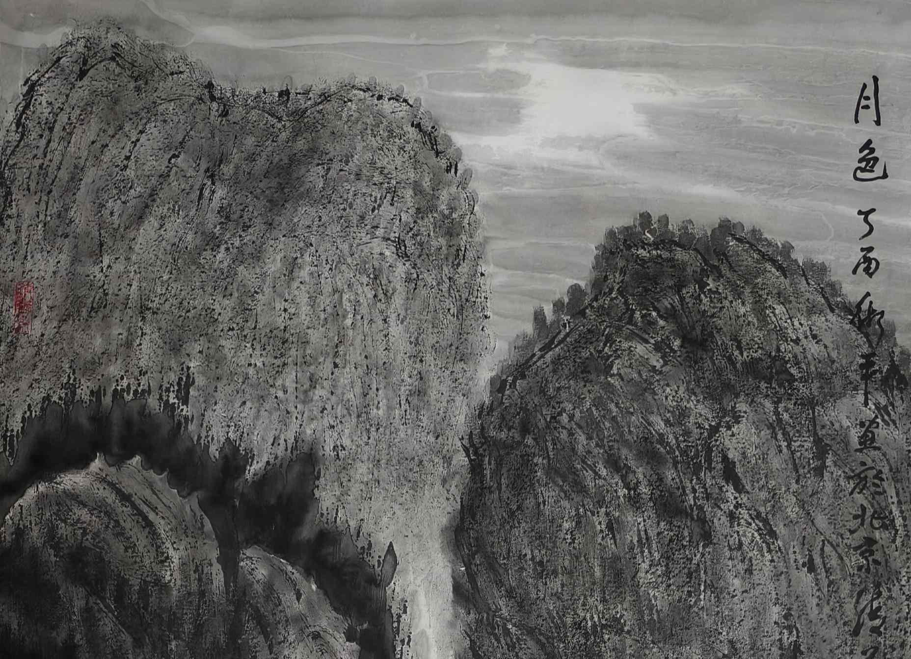 余和平的山水画,最直观的感受便是其酣畅淋漓、气势磅礴的泼墨技法。他深谙“墨分五色”之妙,将泼墨、破墨、积墨等传统技法融会贯通,形成了一套独创的“原生态泼墨”语言。在他的笔下,墨不再是简单的黑色,而是承载着光影、质感与情感的丰富载体。他常以饱蘸浓墨的狼毫,通过腕力的提按顿挫,在宣纸上形成斑驳润染的肌理效果,这种肌理既模拟了湘东地区山石特有的地质结构,又充满了水墨氤氲的抽象美感。