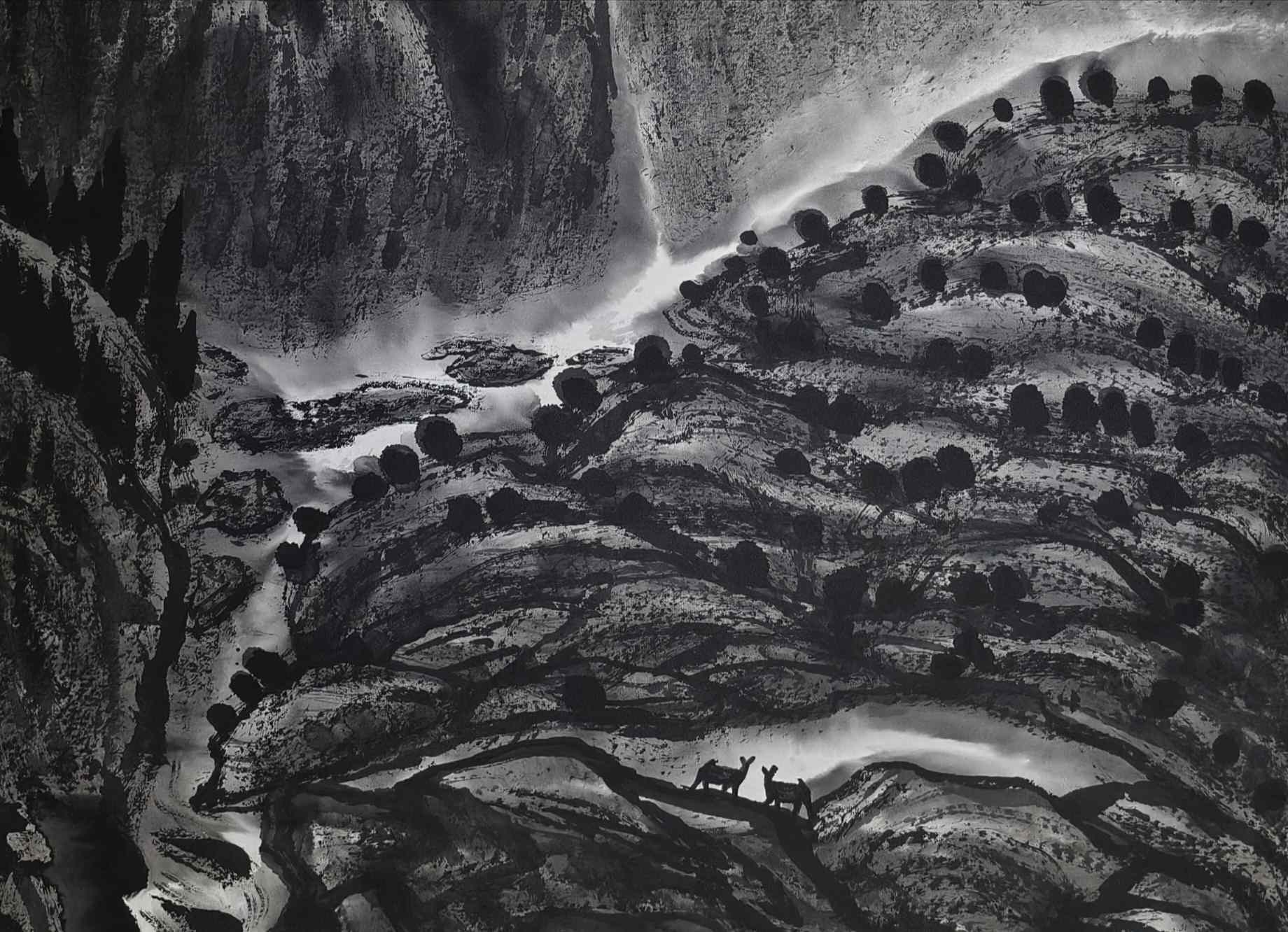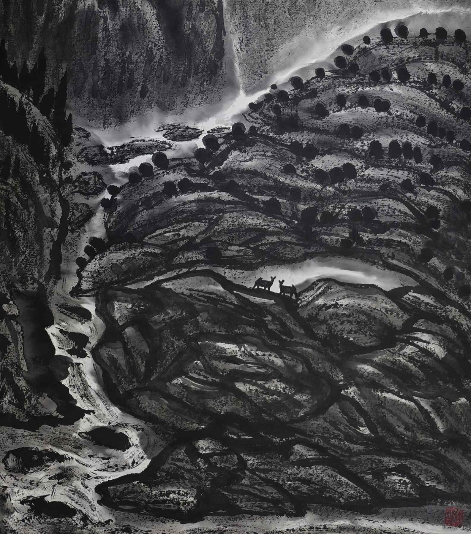 “湘土画派”的核心在于其鲜明的地域特色与人文精神。余和平的作品并非对景物的简单摹写,而是对湘楚大地灵韵的诗性重生。他笔下的山水,是浸透了湘土情怀的精神家园。那蜿蜒流淌的溪涧、错落有致的梯田、隐现于云雾中的农舍,不仅仅是视觉元素的点缀,更是承载着浓厚乡愁的文化符号。他将自己对故土的眷恋,化作笔端的一抹墨色,使画面在苍茫雄浑之中不失生活的温度与诗意的栖居。