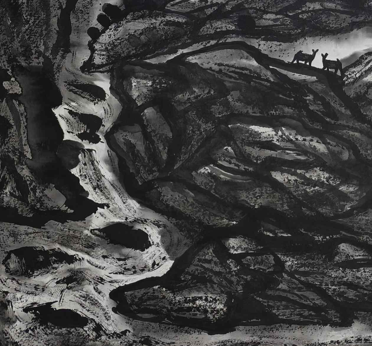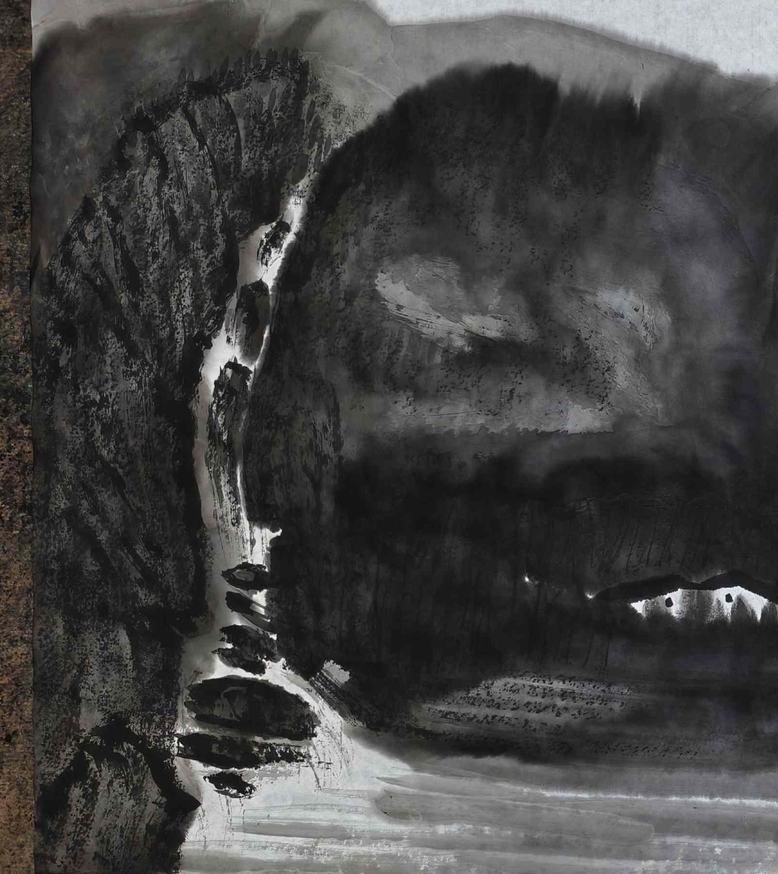 他的创作不拘泥于物象的表面相似,而追求“意在笔先,气韵生动”的写意精神。画面中山峦的脉络、岩石的轮廓、树木的枝干,往往寥寥数笔便形神兼备,看似随意挥洒,实则胸有丘壑。他善于在混沌中开辟秩序,在淋漓的墨色中寻找山川的骨气。特别是对云烟的处理,他常以留白或淡墨晕染,使画面气脉贯通,云雾仿佛在山间流动,营造出“上有巉岩欲坠,下有深涧含幽”的深邃空间感。这种虚实相生、无画处皆成妙境的手法,深得中国传统美学之精髓,也暗合了禅宗“烟消一点一尘埃”的空灵境界。