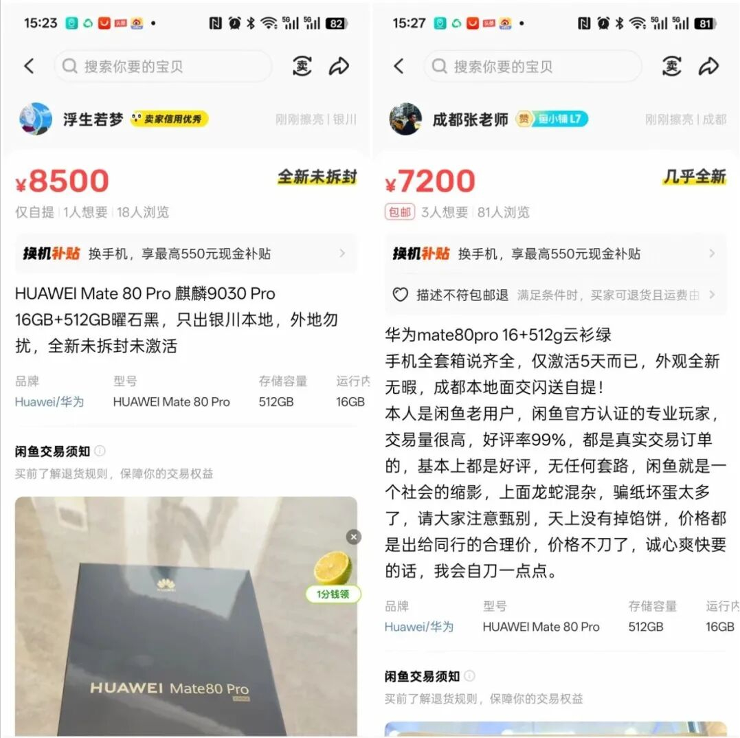 但 16G+512G 就夸张了:官方价6999元,未拆封新机被炒到 8500元,加价1500元;更离谱的是,即便是激活使用了5天的二手机,依然能卖到 7200元,比官方全新价还高200元。
