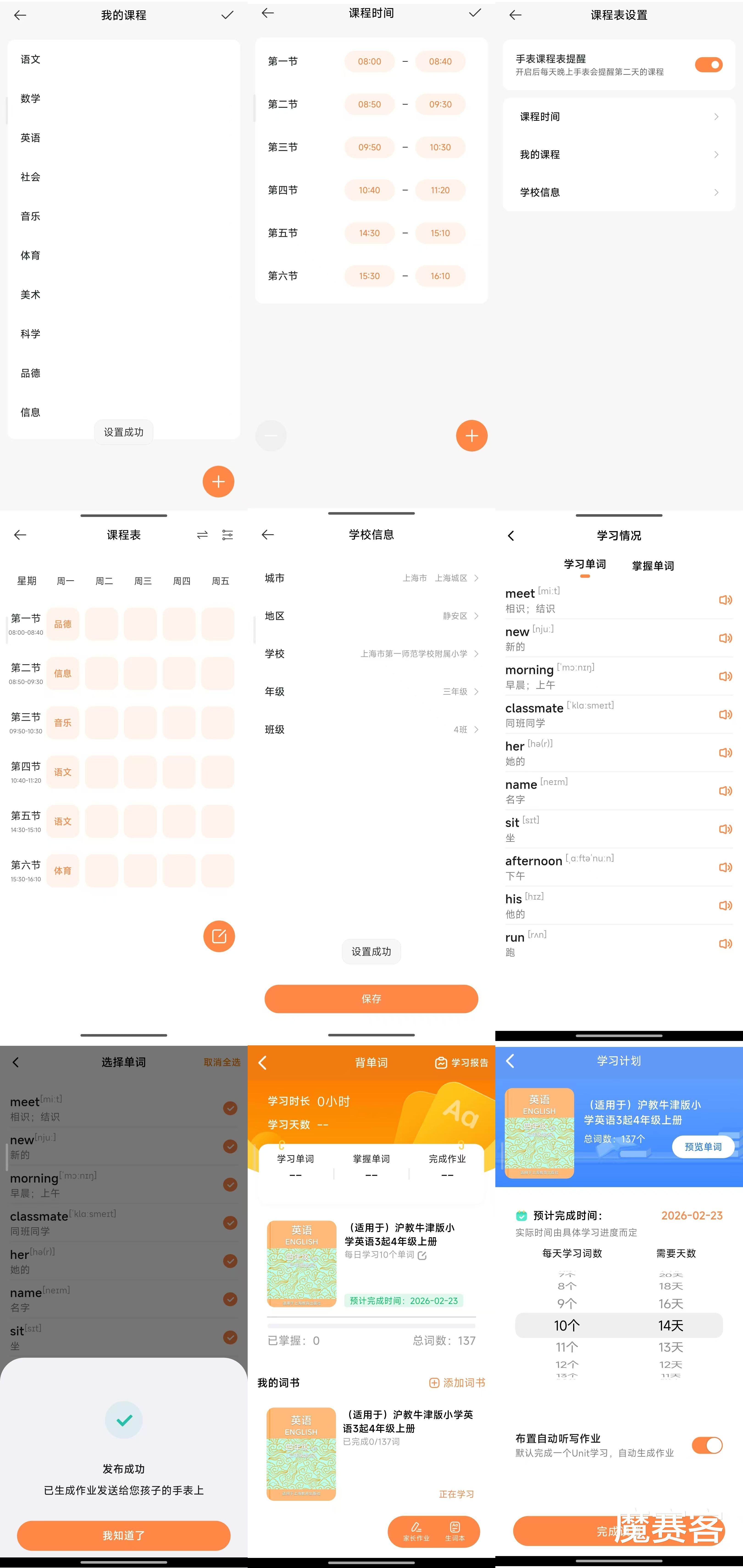 ▲在手机端我们可以选择孩子的学校来生成课程表,这个课程表也可以是自定义的;还可以根据所读年级生成单词表,而生成的单词会推送到手表端。