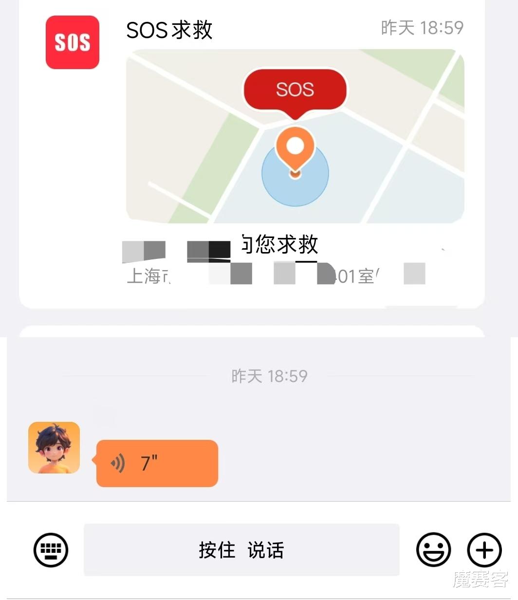 ▲确切的说,手表此时会①发送带定位的一条语音消息,而这个定位可以精确到几零几室(实测偶尔会跑到隔壁,但也精准的恐怖了),②这条语音消息时长7秒,是SOS发出前的7秒手表环境录音内容。
