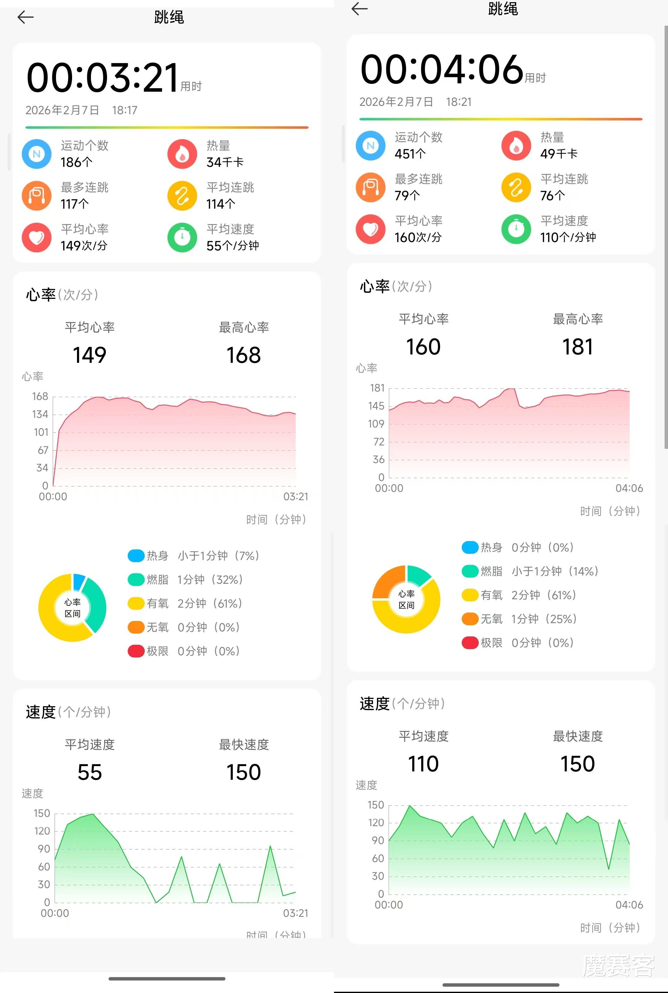 ▲在正式跳绳锻炼之前,我们也可以通过缓慢跳绳来热身。而通过心率,我们便可以看到孩子的热身状态如何,每个人热身心率都不同,我家在120以下算热身状态。整个锻炼过程也不宜太过强烈,最高180左右就好,如果孩子在130以下,那基本属于没怎么认真锻炼了。