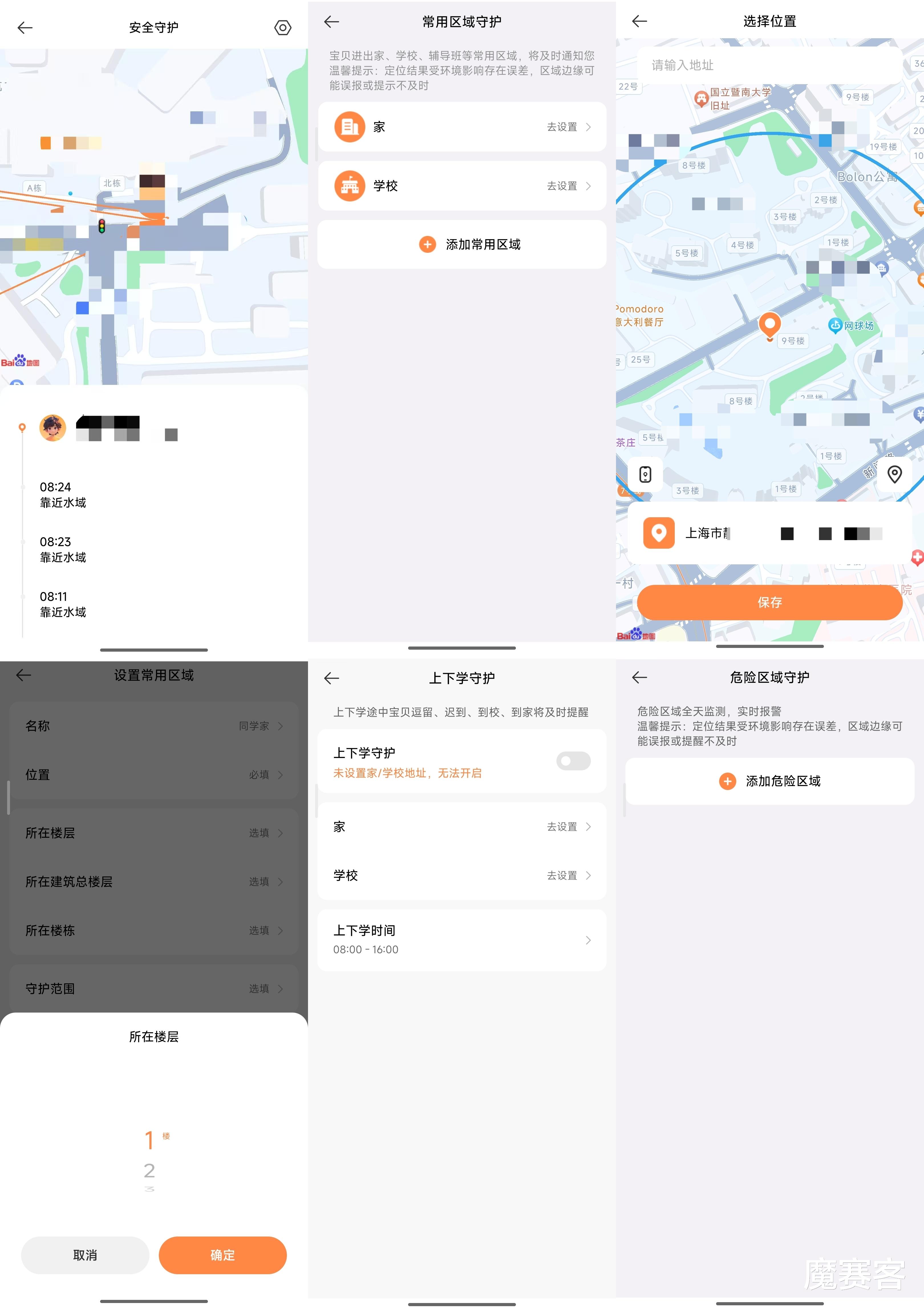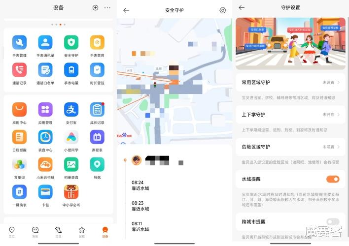 ▲在手表APP里有个“安全守护”,点进去可以看到孩子的实时位置和一些关键信息提示,再点右上角的齿轮设置后可以进入更丰富的功能甚至,比如常用区域守护、上下学守护、危险区域守护、水域提醒、跨城市守护,可以说把定位守护做到了无微不至。