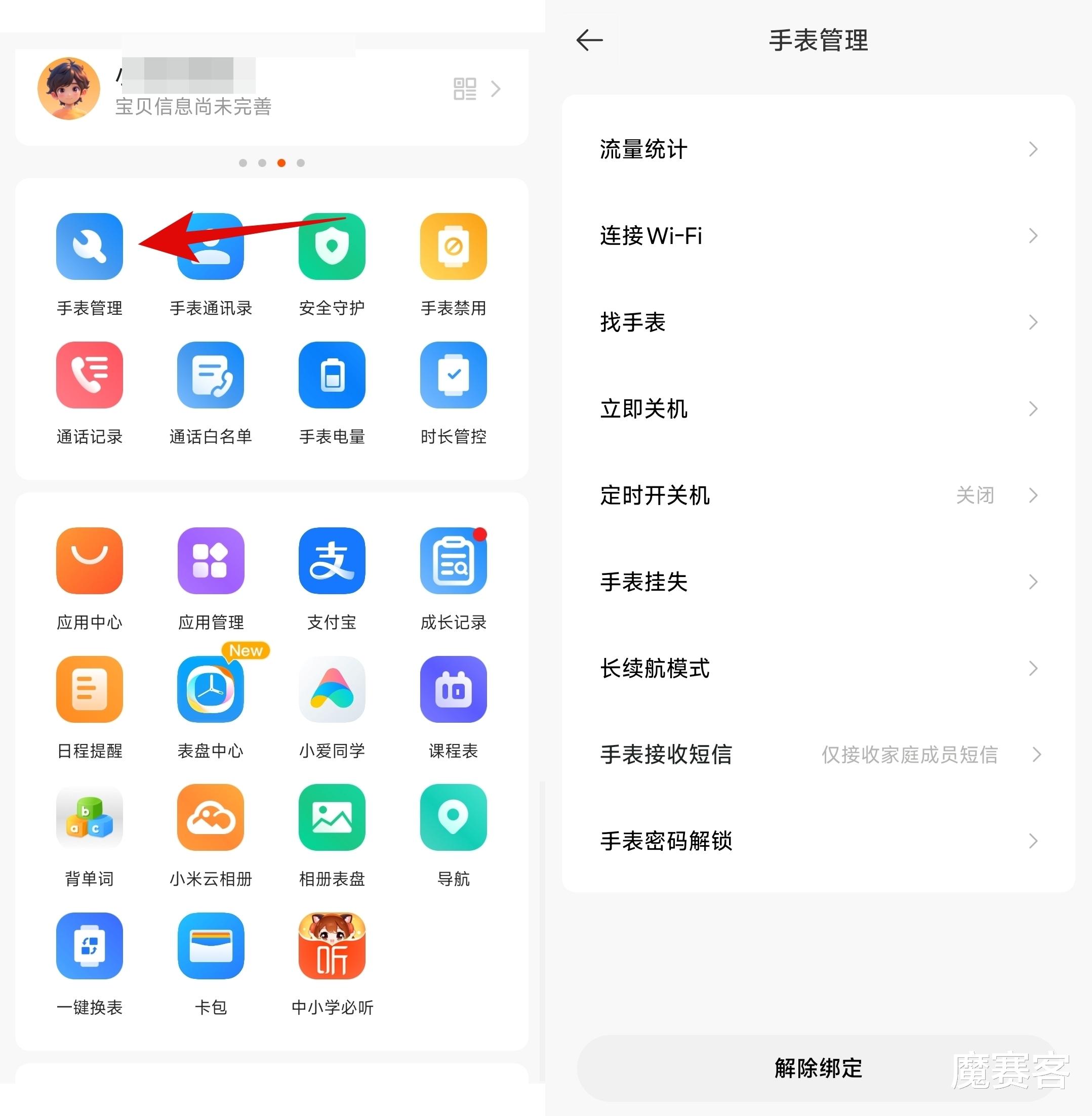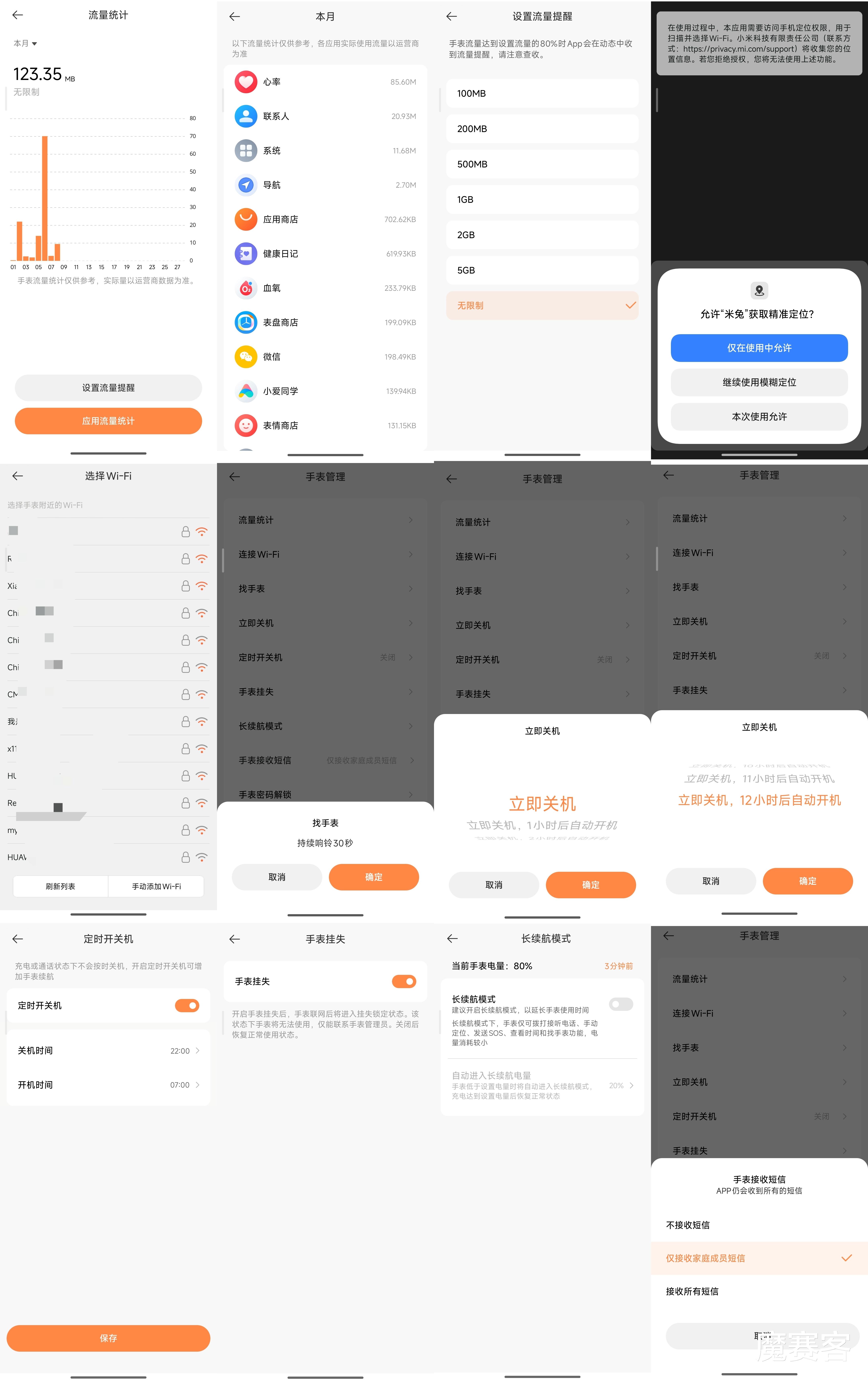 我们在安卓和苹果官方应用商店里下载“米兔”app,绑定手表后,找到对应账号下的“手表管理”,就可以对手表进行基础设置。这些设置有:流量统计、连接WIFI、找手表、关机和定时开关机、手表挂失、长续航设置、接收短信、密码解锁。