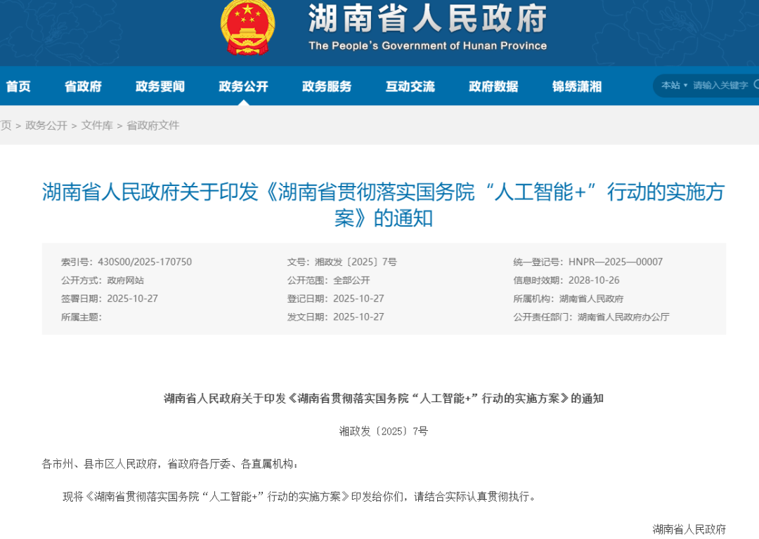 10月27日,湖南省人民政府印发《湖南省贯彻落实国务院“人工智能+”行动的实施方案》。