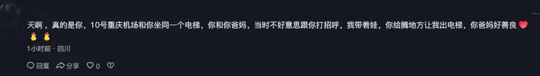 在2月10日,任重和父母三人在机场被网友偶遇。网友和任重一家三口同坐一个电梯,任重看到网友带着孩子,还特意腾出了位置。