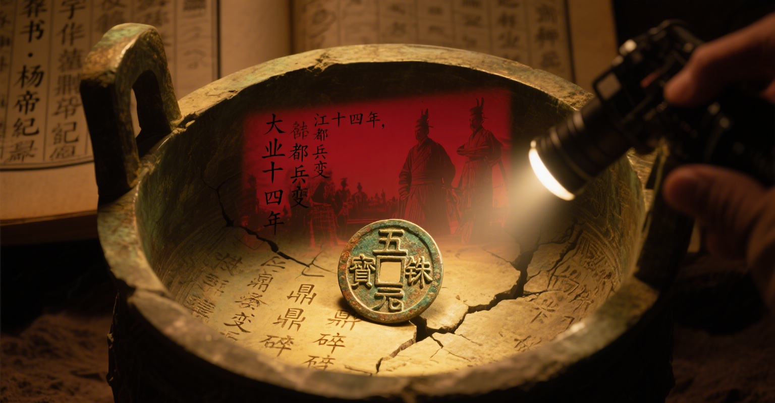当考古队清理至鼎腹内侧,一行小字令专家瞠目:“大业十四年,江都兵变,鼎碎。”这与《隋书·炀帝纪》“宇文化及弑帝于江都宫”的记载形成呼应。更诡异的是,鼎身裂缝中嵌着一枚“隋五铢”铜钱,钱文竟是反刻的!