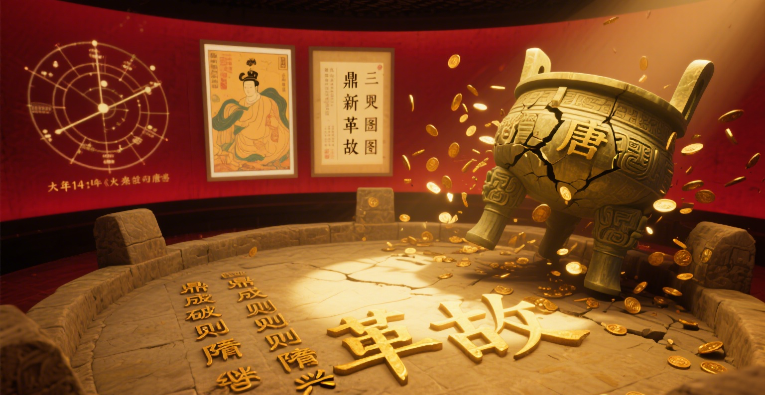 转折发生在鼎底铭文。经技术复原,其上赫然刻着:“鼎成则隋兴,鼎破则唐继。”这与《推背图》中“鼎新革故”的谶语不谋而合。隋炀帝的雄才大略与暴虐无道,在这一方铜鼎上达到诡异的统一。