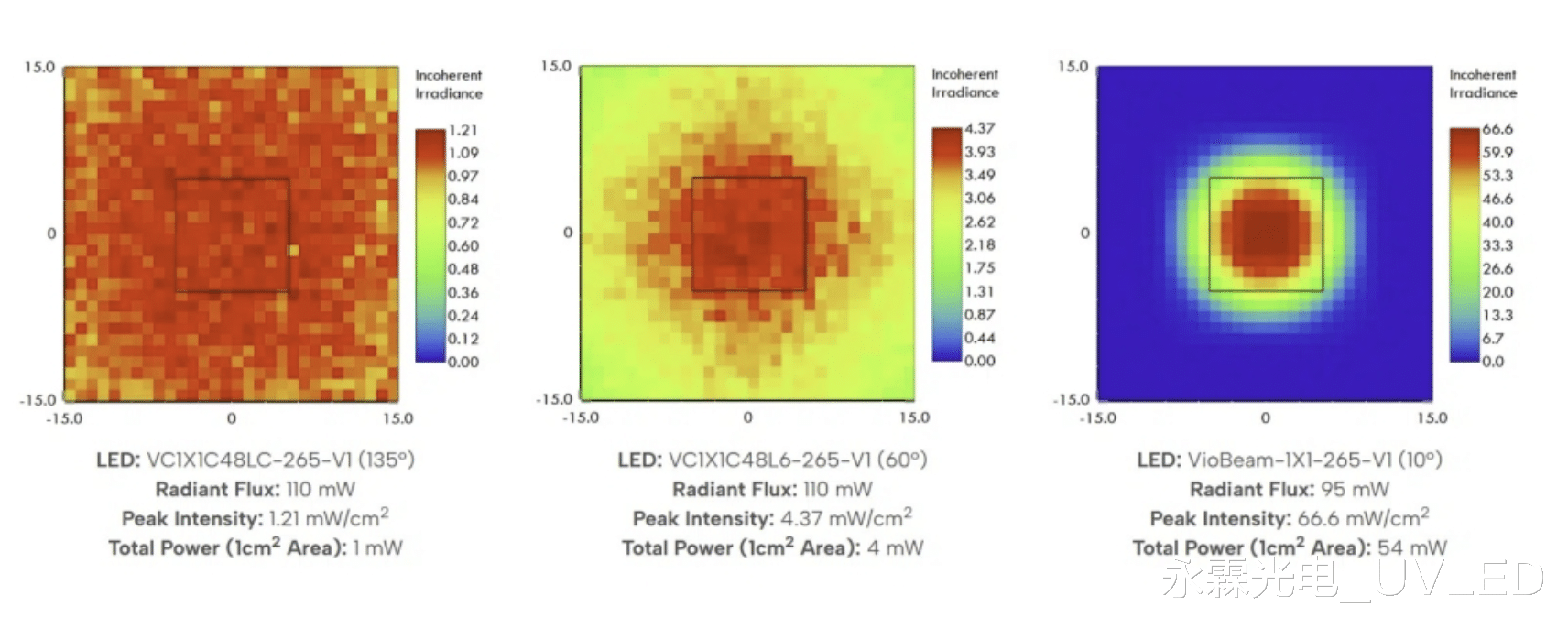 性能提升相比典型的135°平面窗口LED,VioBeam-1X1在50mm距离处的小光斑(10x10mm)上可实现高达55倍的强度提升。公司表示,这使得用户能够用更少的LED数量达到更高的剂量目标。
