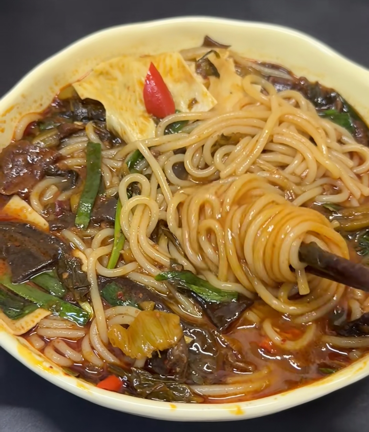 我第一次做的时候,还担心速食会有工业味,结果完全没有,肉酱是实打实的肉香,油菌子带着云南山野的鲜,酸腌菜解腻又提味,连汤都很好喝,室友尝了一口,直接问我是不是偷偷点了外卖,说比外面卖的还正宗。