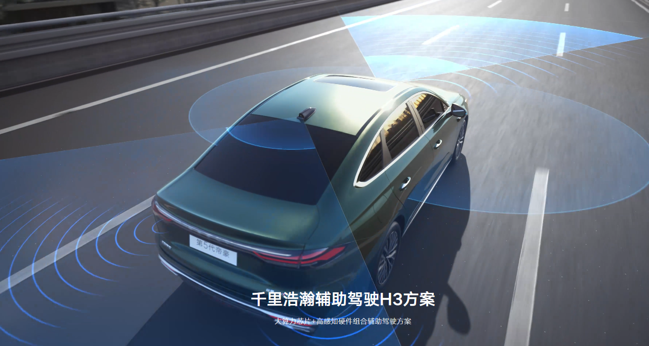依托于强大的底层硬件,第5代帝豪在智能驾驶功能的普及上采取了“双轨并行”的普惠策略。其一是“基础功能全域标配”,将包含ACC全速自适应巡航、AEB-P带行人识别的自动紧急制动、LKA车道保持辅助等在内的完整L2级智能驾驶辅助系统,全面下放至6万元级别的车型上,让入门级用户也能即刻享受到主动安全与行车便利。其二是“高阶能力开放选装”,提供了名为“千里浩瀚”的H3高阶辅助驾驶方案。该方案装备了包括3颗毫米波雷达、11个高清摄像头在内的总计26个高精度感知元件,构建了720度无死角的感知冗余网络。结合其搭载的算力达128TOPS的智能驾驶芯片,该系统不仅能在结构化高速路上实现导航辅助驾驶,更计划通过后续OTA升级,逐步开放城市道路的辅助驾驶能力。