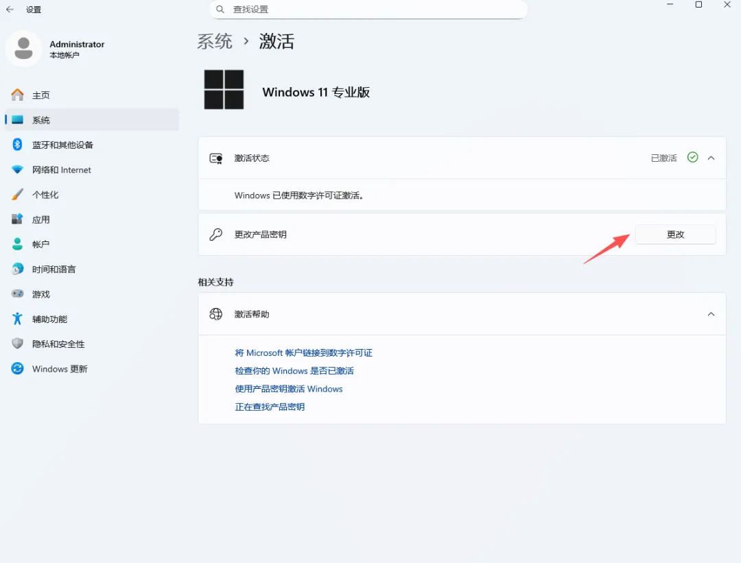 进入之后,就能看到激活状态界面。老田的系统已经激活了,所以看到的是更改按钮。