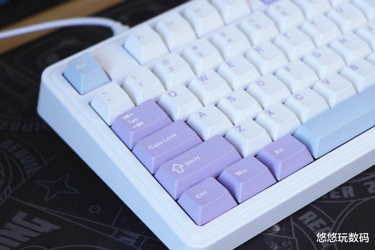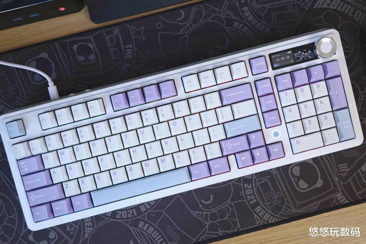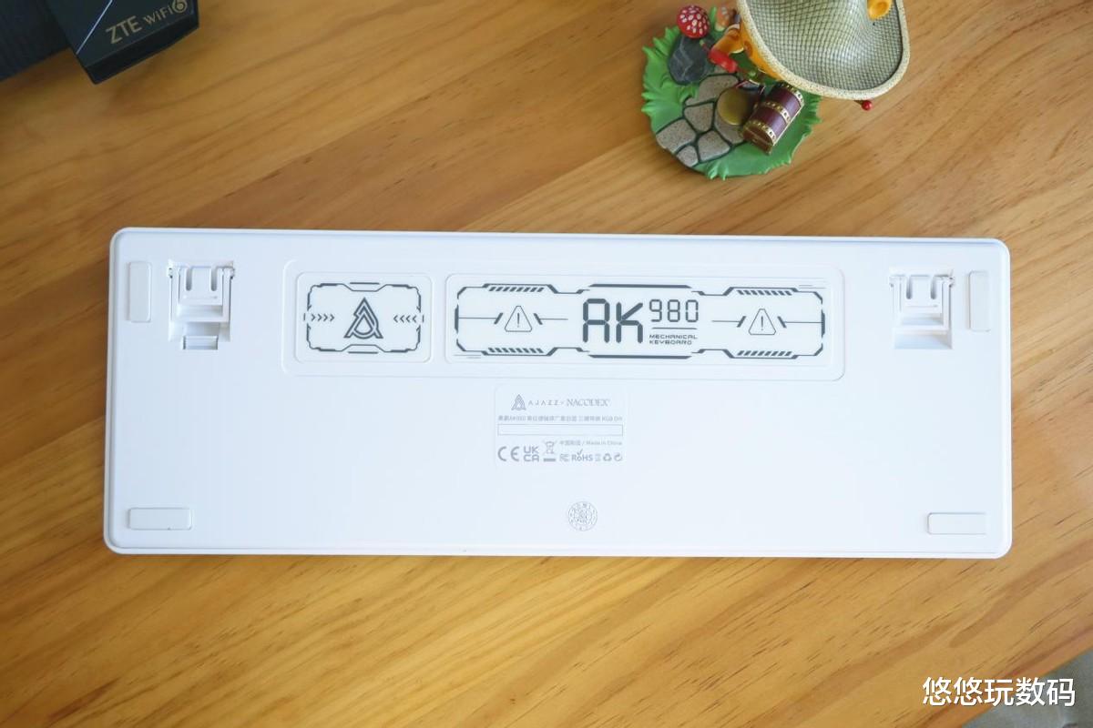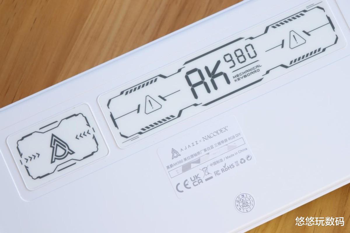 黑爵AK980带屏版采用了98键配列,这种设计不仅让整个键盘尺寸更小一些,而且还拥有了独立的数字键区,体验上比较接近全尺寸的104键。黑爵AK980带屏版有雾川海、星晚灰和黑莓粉三种颜色可选,黑莓粉的渐变色设计在机械键盘上看起来很特别,如果对厌倦了纯色键帽黑莓粉绝对是个不错的选择。黑爵AK980虽然从键帽颜色看只有3种,但其实每个颜色下都搭配了个性图案,每个键盘的背面都有独特的图案。