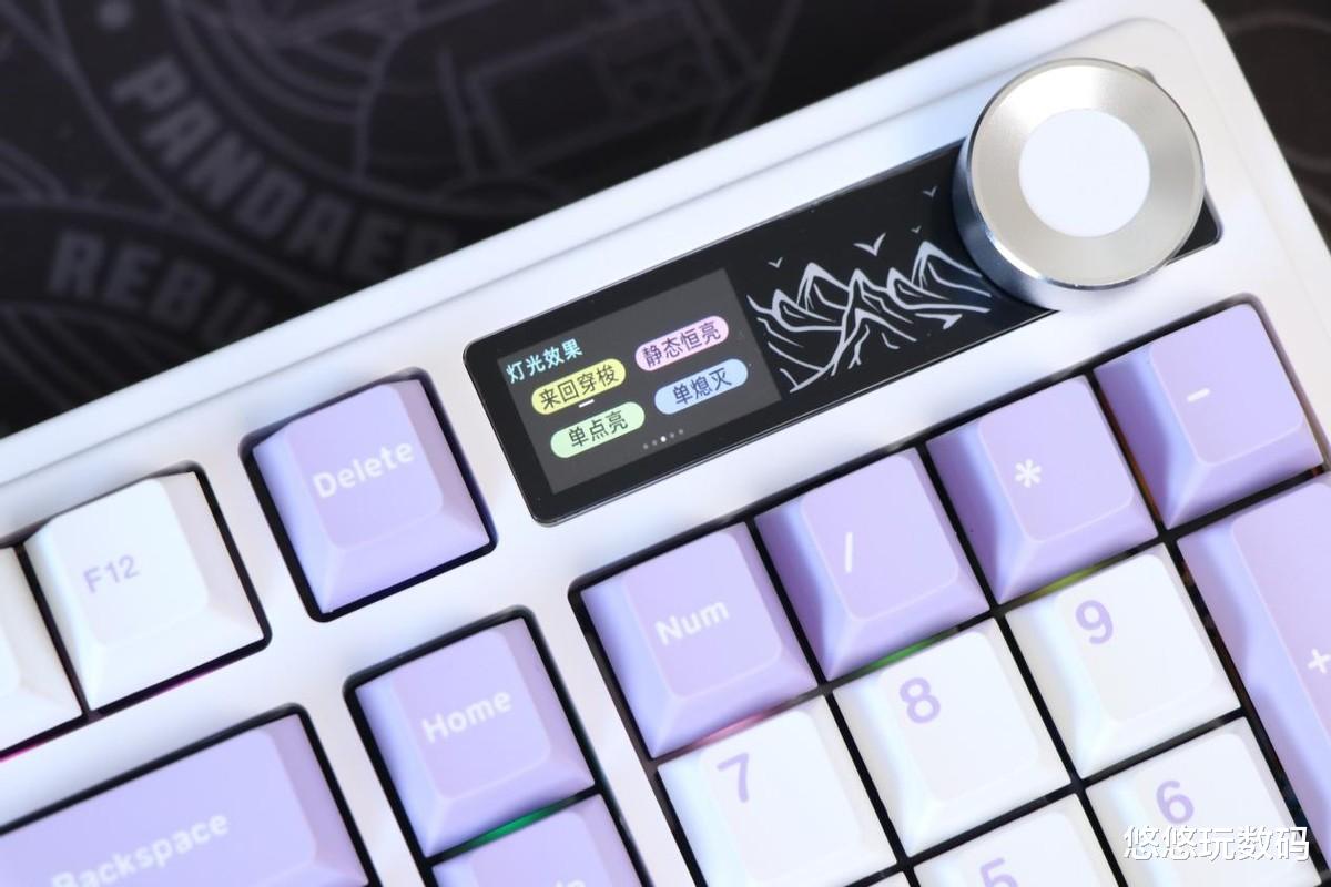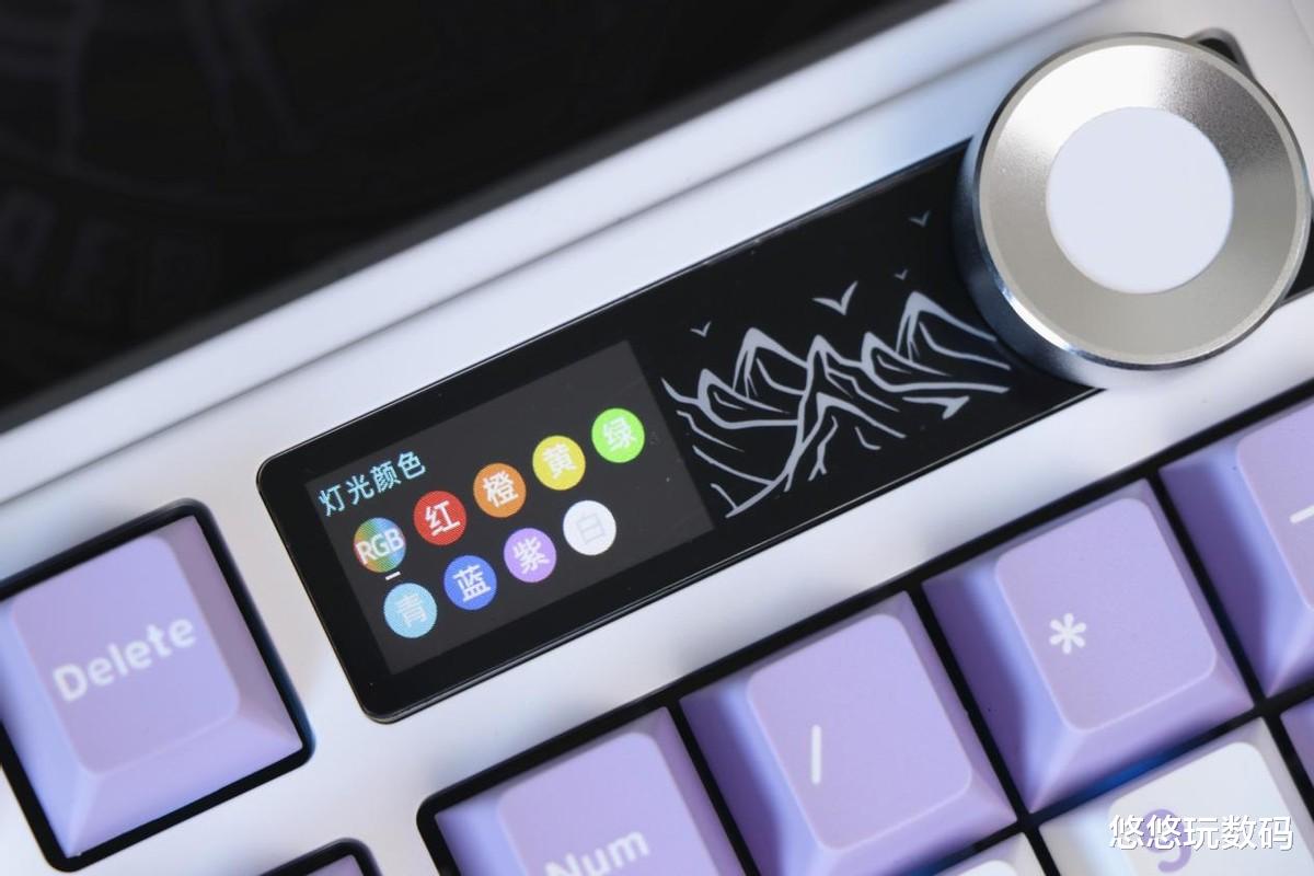 黑爵AK980带屏版的一个最大亮点就是在键盘右上角位置多了一块1.14寸彩屏,这块屏不仅可显示当前的时间和连接模式,同时还能借助旁边的金属质感圆形旋钮进行一些设置,例如可借助屏幕更换RGB灯光效果、颜色、亮度和速率等,同时还能选择屏幕语言。另外,旋钮还能调节电脑音量大小和开/关静音(按压)。这里不得不说黑爵AK980屏幕上的时间能够与电脑实现自动同步,而且在不使用的时候也不会出现错乱的情况。