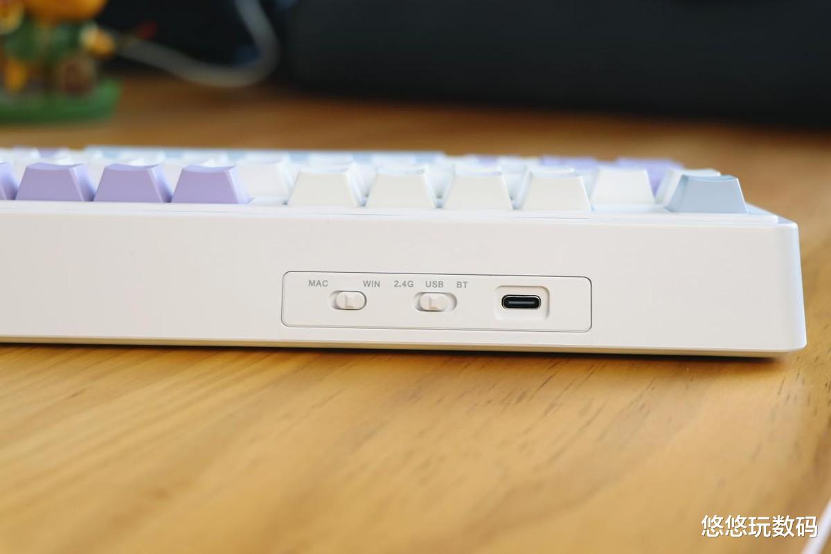 黑爵AK980后侧面设计有TYPE-C有线(充电)接口、连接模式切换键和系统切换键,可以实现USB有线、2.4G无线和蓝牙三种连接模式切换,同时还能在WIN和MAC系统之间切换使用,满足不同玩家的需求。