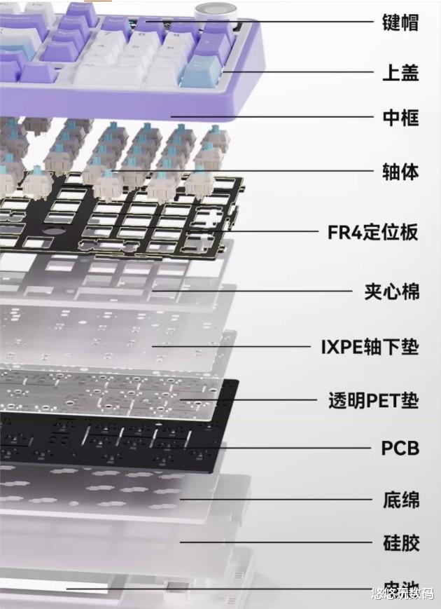 黑爵AK980按键使用了主流的Gasket结构,搭配FR4单键开槽双面沉金定位板,与PC定位板开槽相比手感更稳,打字更为舒适,透光性也更好。另外黑爵AK980采用了PO棉+IXPE轴下垫+PET垫+底部硅胶+PO轴座棉5层填充,使其使用手感不至于太柔软,就算用久了键盘也不会有松散感,而且敲击声清脆干净。