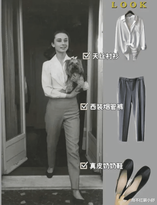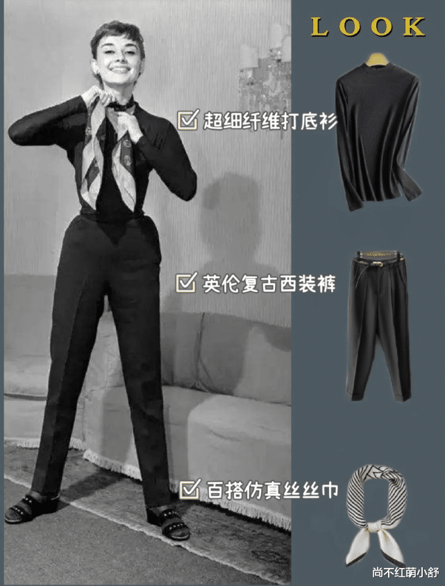 穿搭示范1:赫本那套经典的灰色系列配色,一件高领打底衫简约优雅,勾勒出颈部柔美线条;利落的西装裤干练大气,尽显潇洒风姿。一条真丝丝巾轻盈点缀,为整体增添灵动与精致,于低调中彰显非凡品味,将优雅气质展现得淋漓尽致。