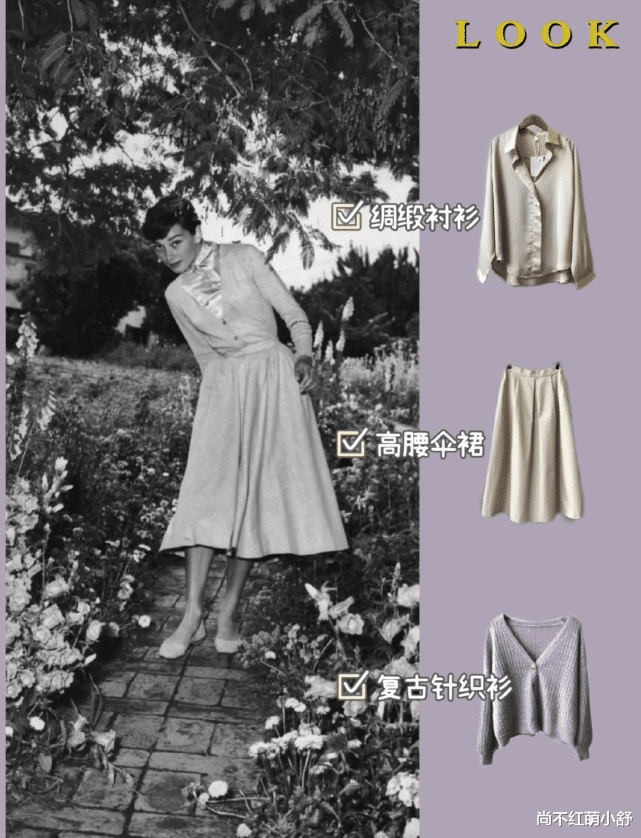 穿搭示范2:赫本这套暖色配色打扮也爱了。一件质感上乘的绸缎衬衫,泛着柔和光泽,自带高级感。搭配高腰伞裙,巧妙提升腰线,凸显纤细腰肢,尽显优雅浪漫。外搭一件复古针织衫,瞬间增添温婉氛围,三种单品碰撞,打造出复古又时髦的独特风格,魅力十足。