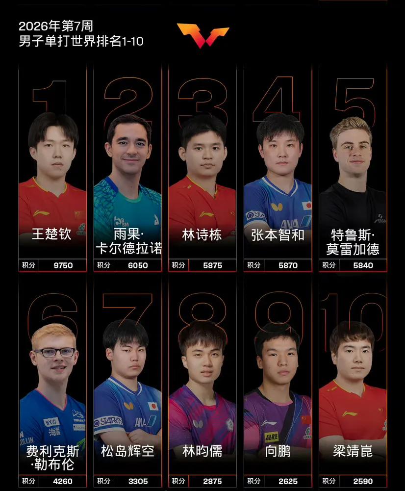 2026乒乓球最新第七周世界排名出现了调整,林诗栋不再排在世界第二,有了退步,排到了第三,而外国选手雨果进步很大,超越林诗栋,来到了第二名,排在世界第一王楚钦后面,张本智和也是排到了第四名。