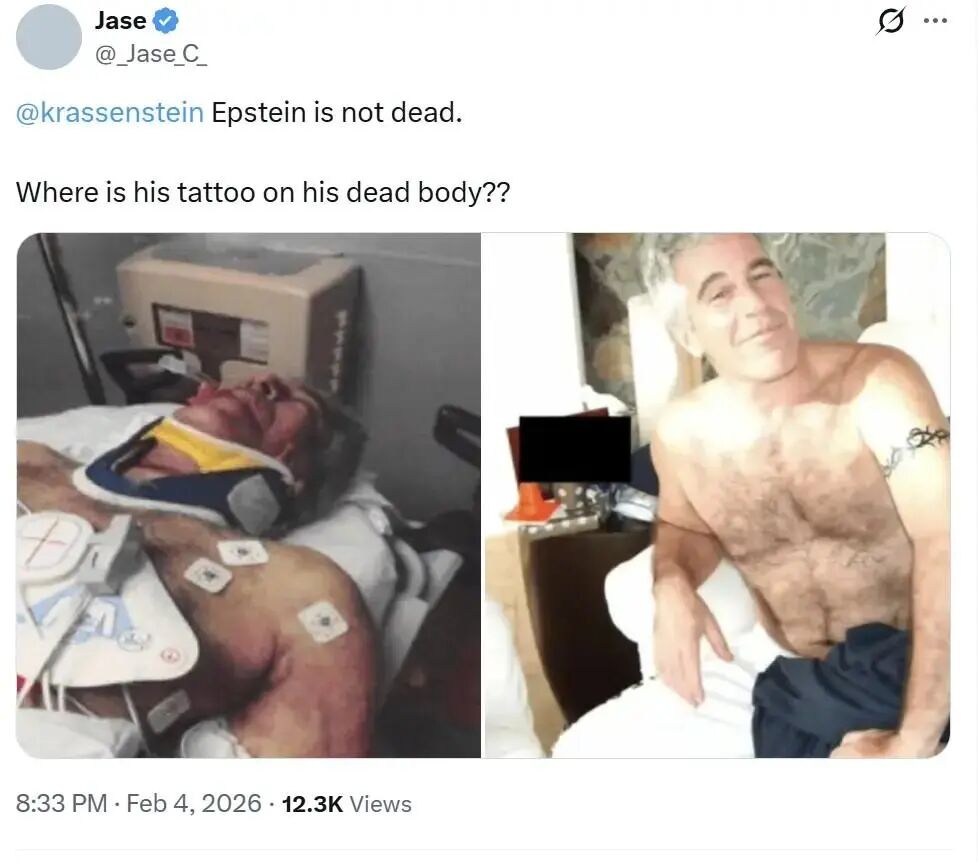 “还有没有其他显示爱泼斯坦有这个纹身的实况照片?这看起来明显得有点像是在刻意误导。”
