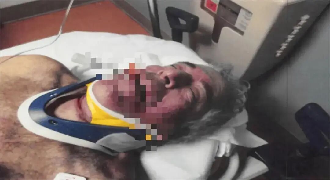 爱泼斯坦的裸露胸膛上贴着电极片,脖子上戴着颈托,担架上绑着氧气罐,一根透明管子通向他的嘴,身上还连着静脉输液管。