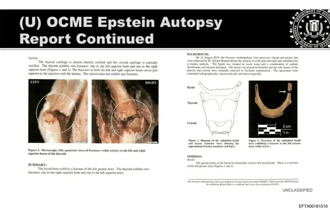 爱泼斯坦的律师们抗议,认定他的颈部伤势更像他杀,其舌骨骨折方式表明他是被人从背后勒死的。