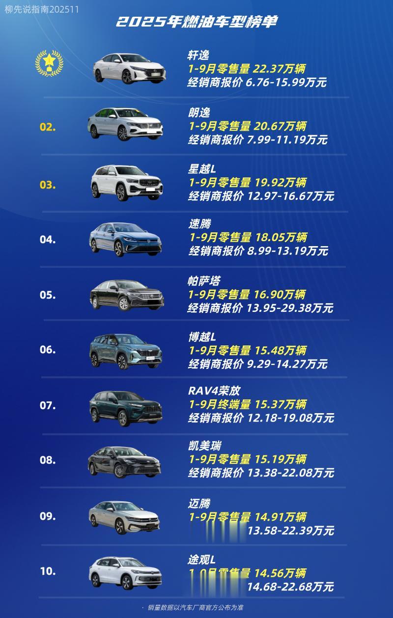 自主燃油车方面,吉利星越L排在榜单第三位,今年1-9月累计零售量约19.92万辆,是2025年最畅销的燃油SUV之一。