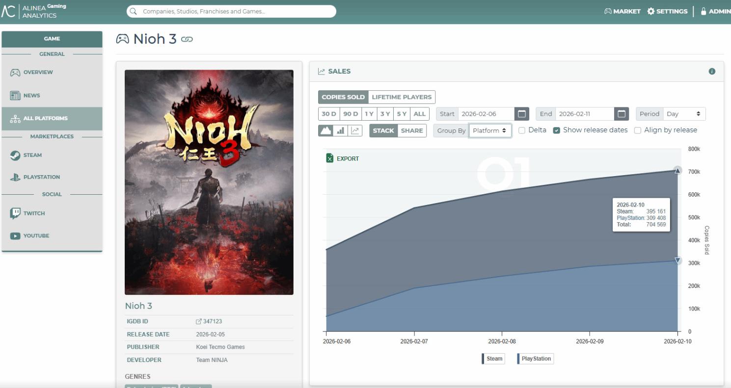 DoNews2月13日消息,数据分析机构 Alinea Analytics 估算,截至2月10日,发售仅四天的魂系游戏《仁王3》总收入已超5000万美元。游戏四天销量破70万,其中 PC占 56.1%,PS5占43.9%。