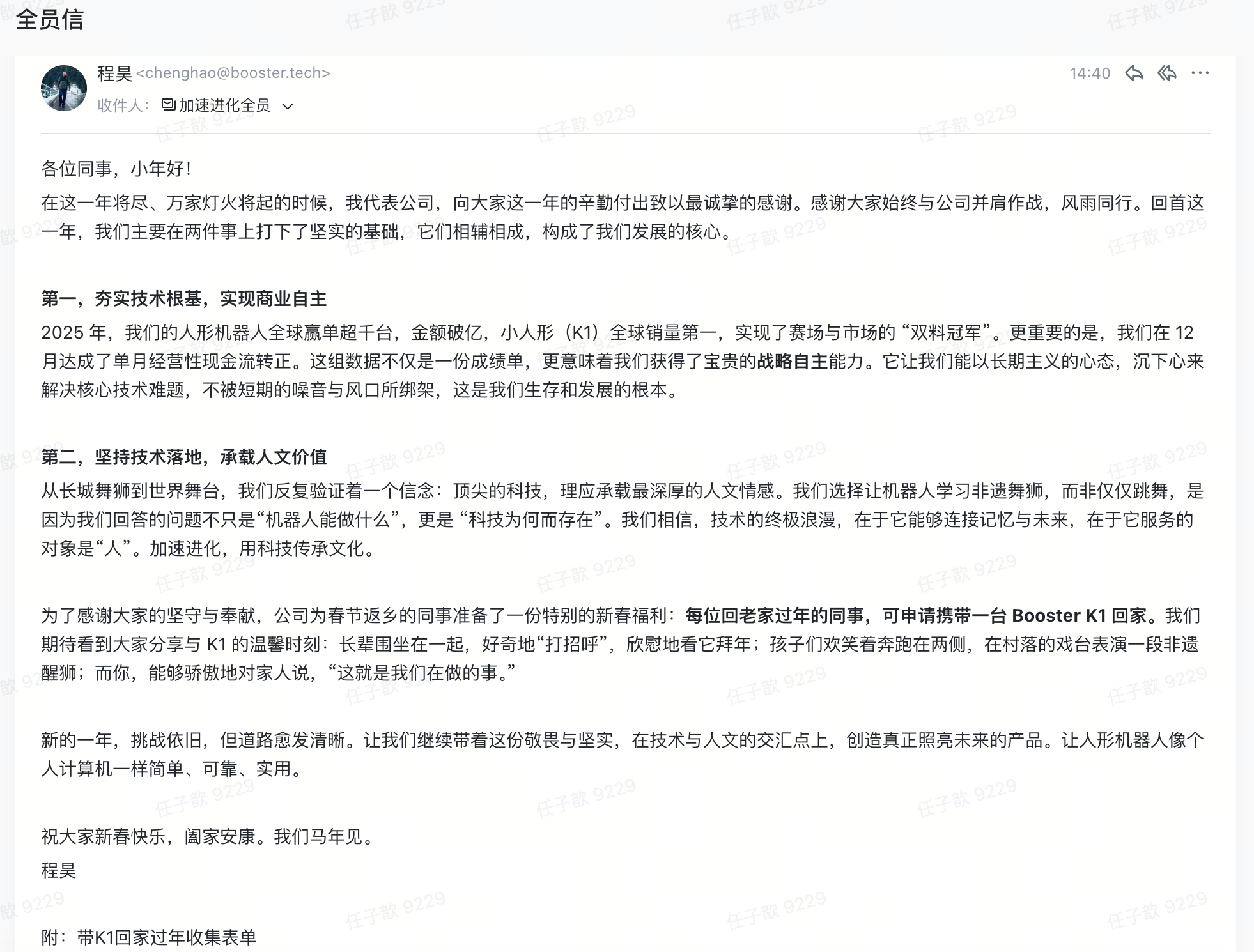 为回馈员工,加速进化推出专属新春福利:春节返乡员工可申请携带Booster K1回家,让科技成果走进家庭。加速进化坚持"工业自动化+具身智能"双轮驱动战略,其2025年具身智能业务订单规模已突破2亿元,核心优势在于"核心零部件自主研发+整机ODM/JDM交付"的全链条能力,已实现近2000台整机的规模化交付。