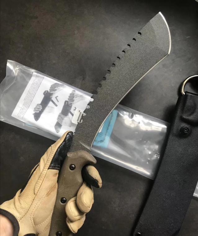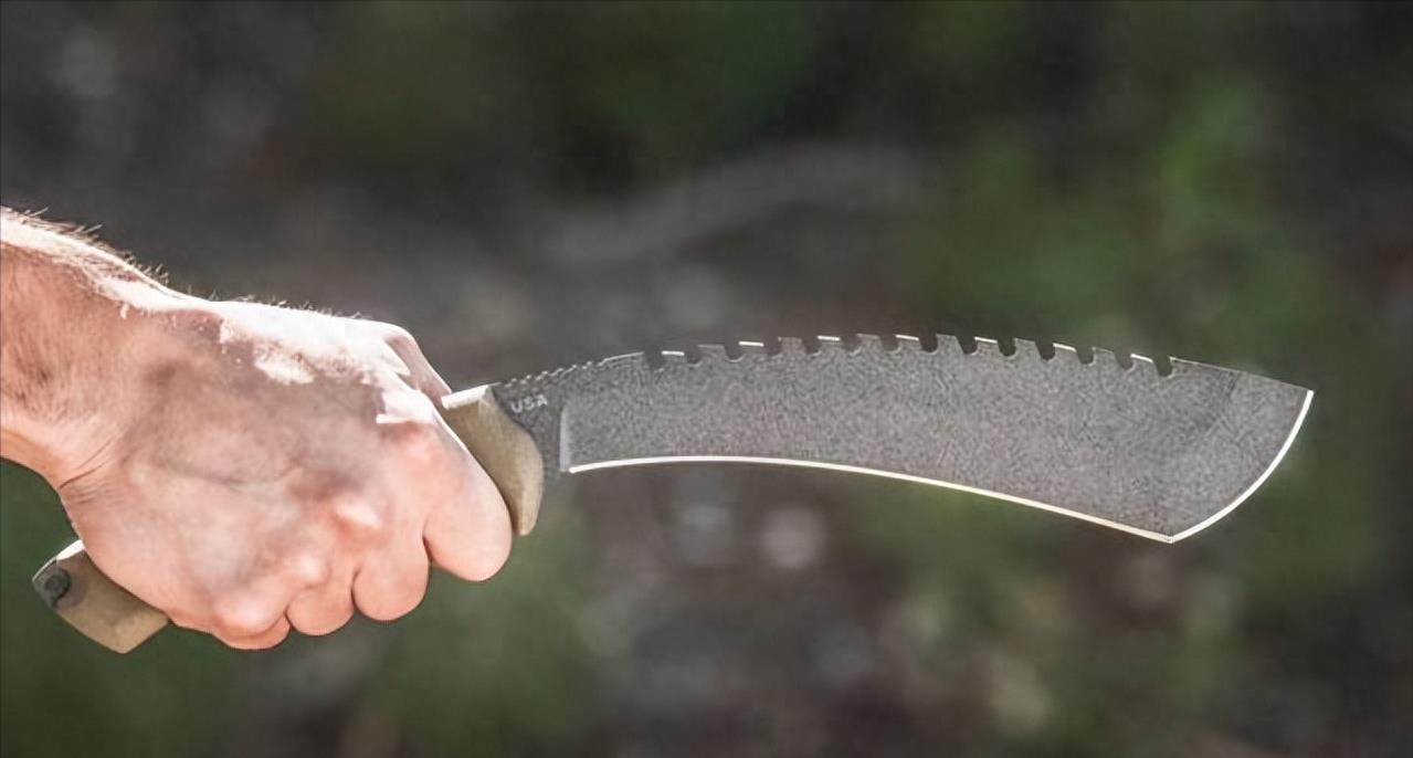 这款排障刀劈砍力极强,像是灌木藤蔓一类的障碍物基本上能做到一刀两断。该刀的刀身采用1095高碳钢作为材料制造而成,这种钢材含碳量达到了1.03%, 除此之外还含有少量的铬、钼、钒元素,经过热处理后硬度可达HRc58-60并且拥有着极强的韧性,,但是在耐腐蚀性能上就差了一些。这种材料大部分被应用于猎刀、丛林刀以及排障刀,二战期间有名的美国“KA-BAR”军刀就是用的这种材料。