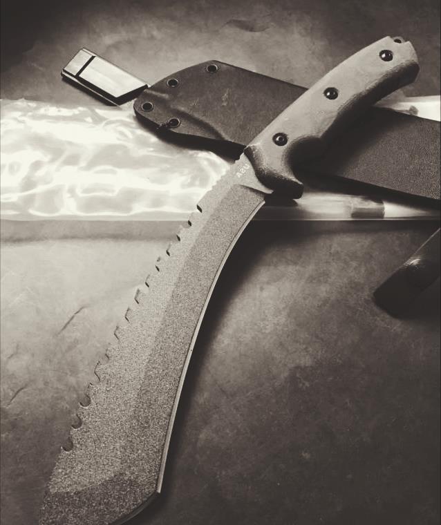 这一种TOPS尖端恶龙排障刀全长36.2CM,刀身的厚底则是0.48CM,该刀采用和尼泊尔弯刀极为类似的设计,刀身重心在前宽刃后背,基础点全部加在了劈砍上,基本上已经放弃了穿刺的功能。该刀的反曲弧度很大,刀背上制造有多道类似于锯齿的齿孔,整体看上去就如同龙的脊椎骨一般所以能被称之为恶龙。这款排障刀采用平磨法进行开刃,刃部有一段刀身还专门进行了打薄处理。