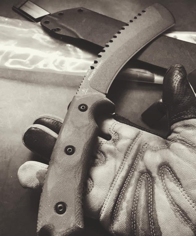 TOPS这种排障刀的刀身表面还经过了石洗处理,耐磨损耐腐蚀性能上有极大提高。接近刀柄的地方还设计有可以用大拇指按压来控刀的滚齿,该刀采用一体式龙骨设计,刀柄的柄材则采用了轻便经济的米卡塔材料进行制作,最后与刀身之间用六角螺栓进行固定,更换拆卸都很是便利。刀柄的设计也极为符合人体工程学设计,前端的指槽在持握的时候可以贴切的容纳手指,一般情况下很难出现打滑脱手的情况。