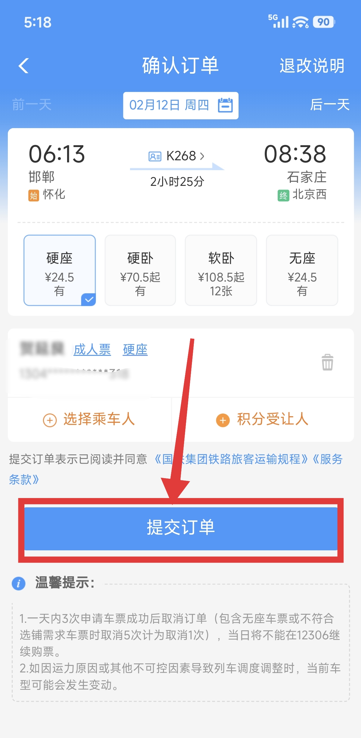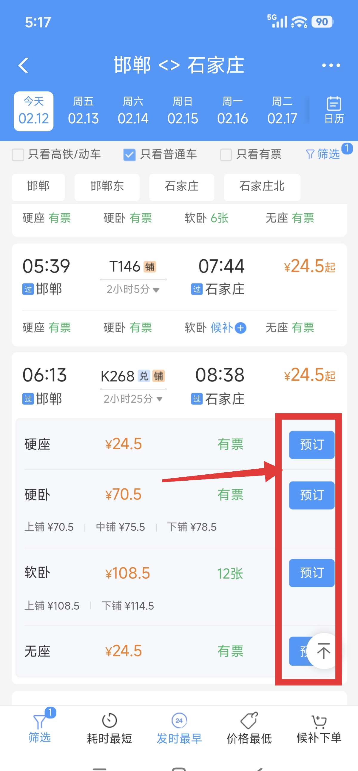 3.进入到该页面后,选择(座的类席)比如硬座。