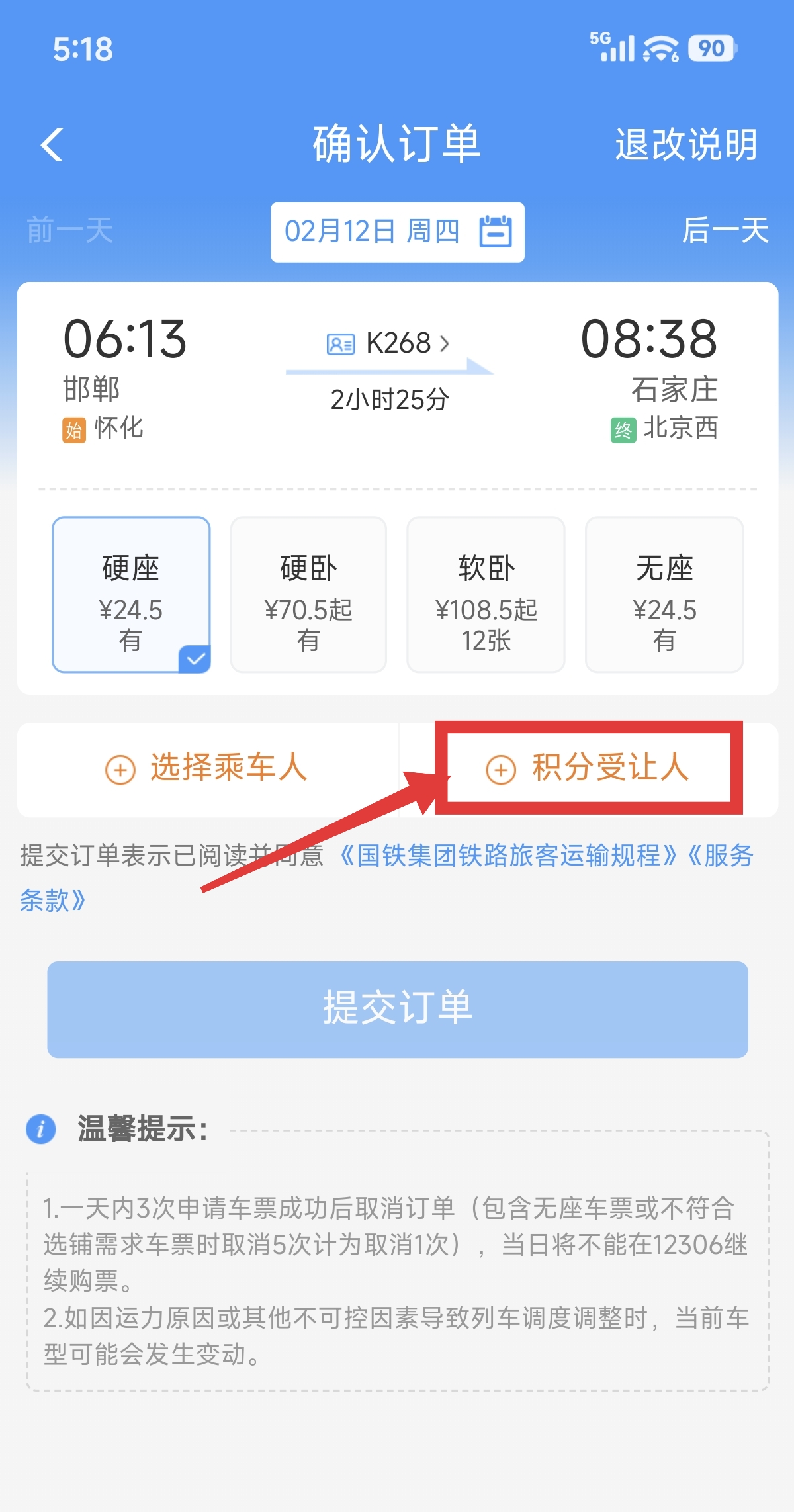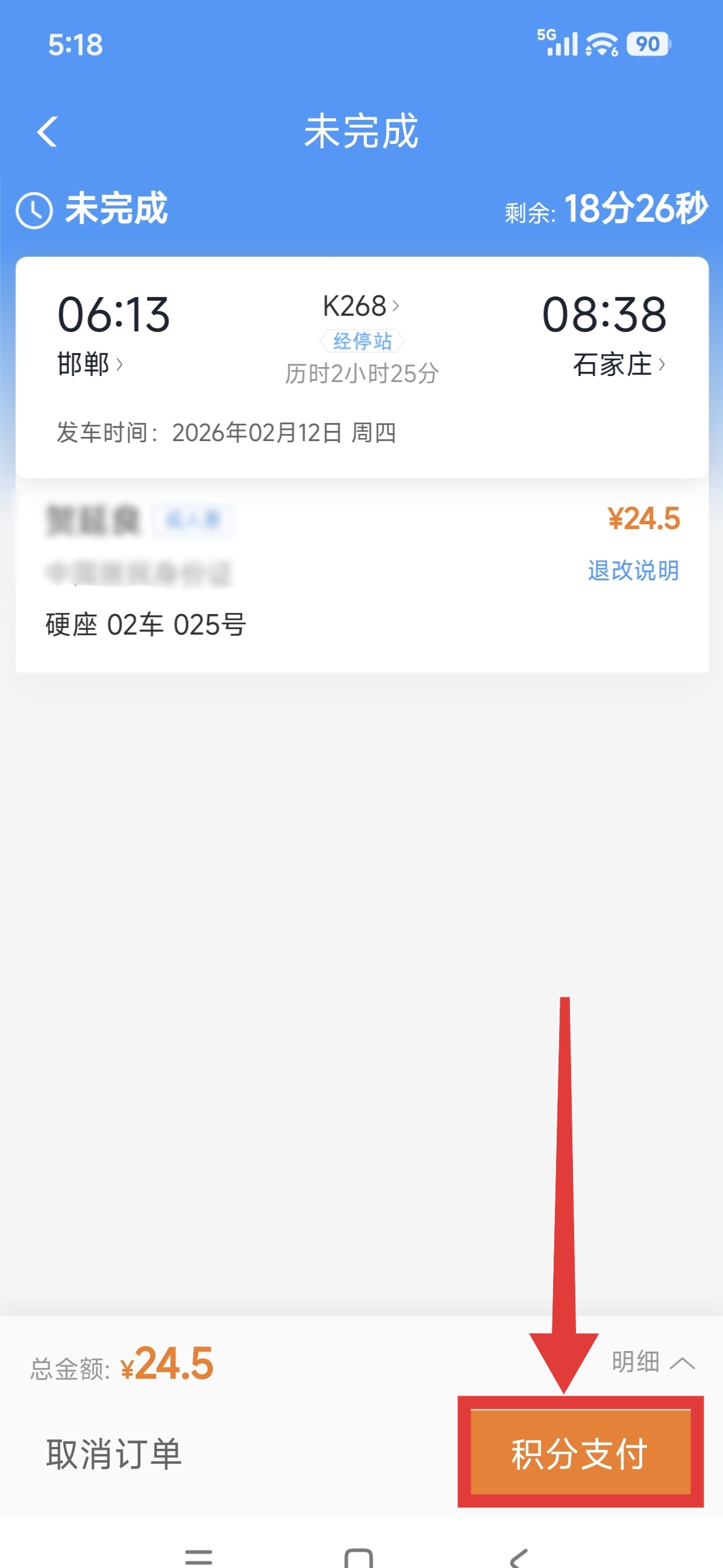 8.进入到订单页面后,点击【积分支付】即可完成积分购买车票了。