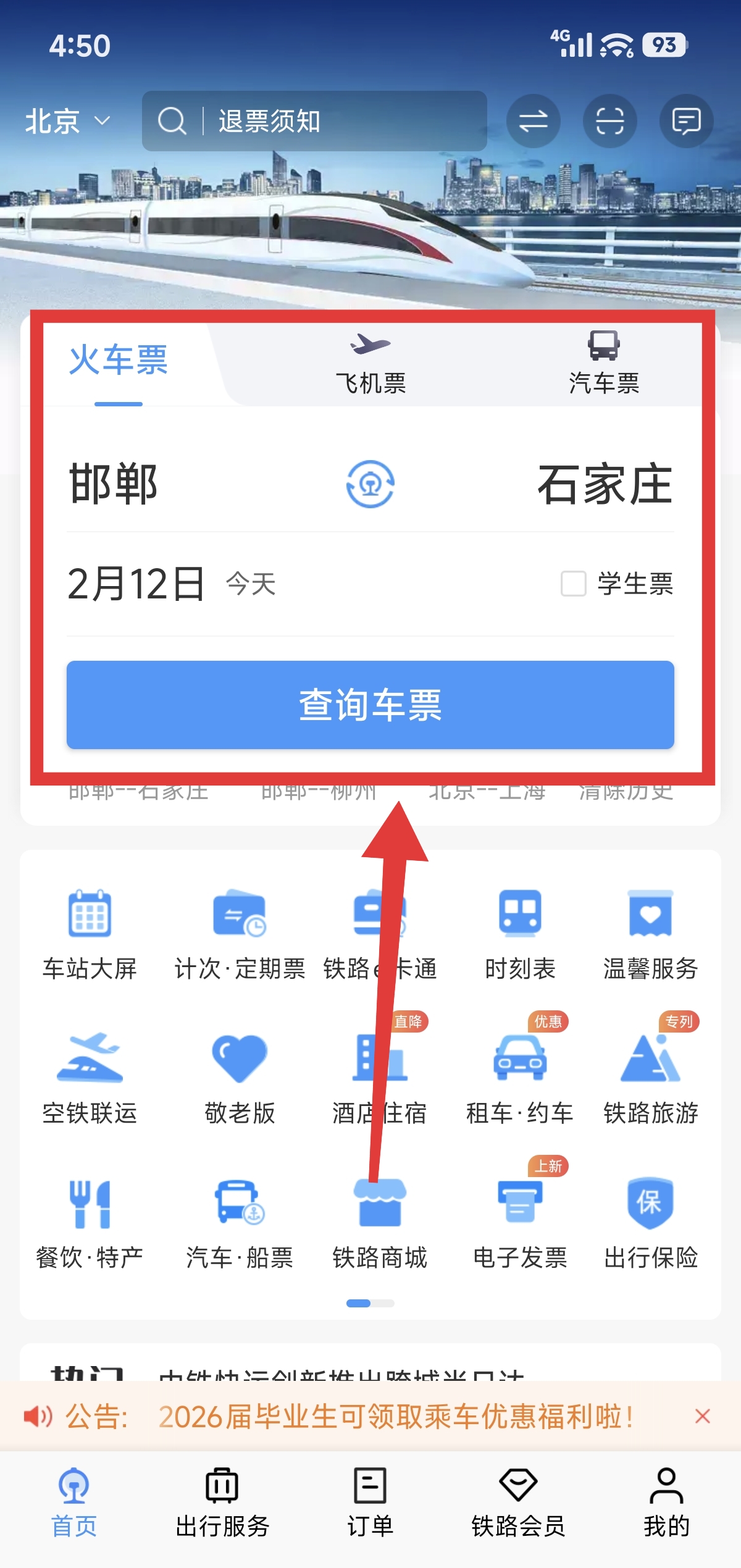 2.进入到主页面后,输入(始发站和终到站),然后点击【查询车票】。