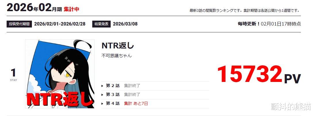事件起因是一位网名为 “不可思议酱” 的作者投稿的漫画作品《NTR 返し》。该作品在2026年2月的排行榜中一度获得浏览量首位,按照规则,如果在3月8日公布的整月结果中依旧位居第一,作者本可以获得在漫画 APP“JUMP+”“独立作者专区” 的刊载资格。